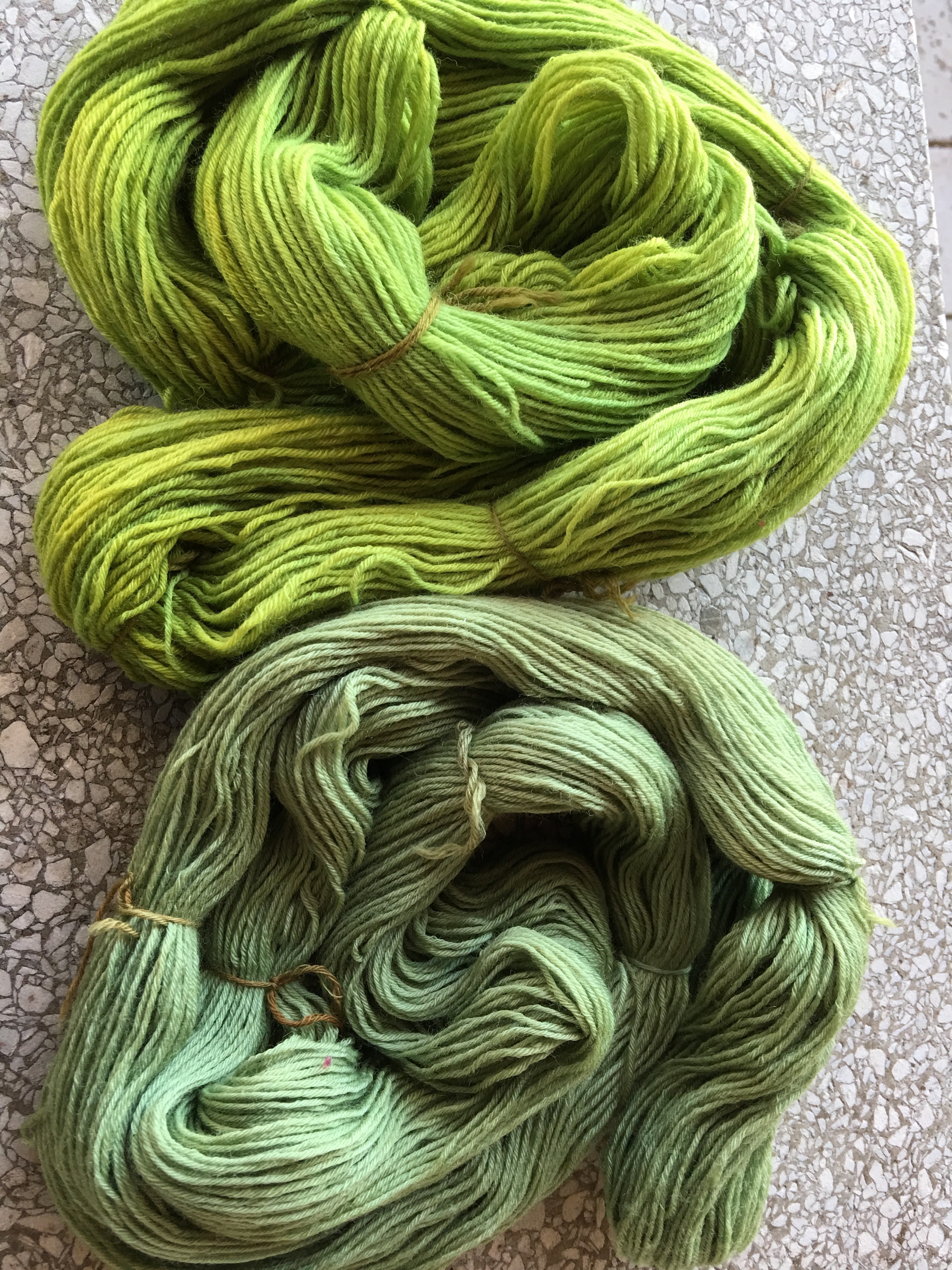 Comparison of different dyeings of yarn dyed in black bean bath and overdyed in marigold, first dyeing top, second dyeing bottom