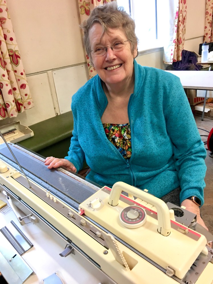 Rachel has been organizing weekend get-togethers for British machine knitters at the social hall in her village of Fladbury every four months for the last year, and she invited me to join them for the most recent one. That was an exciting invitation, but I was a little apprehensive because my early bad experiences with machine knitters who I had asked for help had left me with the suspicion that I’m just a little too weird for machine knitters to accept. Rachel assured me that I’m not actually all that weird and everyone would be kind to me anyway, and I trusted her because she has never steered me wrong. So I arranged a week’s visit to the UK, with a Friday evening to Monday morning stay at Rachel’s house, sandwiched between visits with my knitting friends Gwen and Liz, Gwen before the weekend and Liz after.