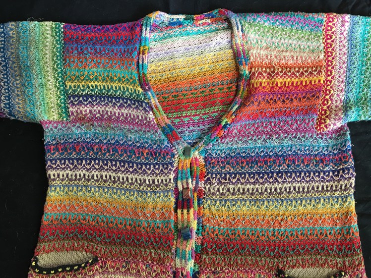 I just went digging into a closet where, years ago, I had shoved some of my first works of glorious color excess. A couple of them have aged better than I expected. My first Kaffe-inspired work, a coat that directly used his chart, construction method, and the general idea of his neutral background colors, was unexpectedly pleasing. And, hey, wow, pockets in clashing red! I’d forgotten about the pockets. My eye keeps returning to that rust-colored gradient and its relationship to the pink-purple gradient just above it. The pink is almost transgressive, but it makes visual sense as an extension of the orange gradients that are a prominent feature of the coloring of this work. Is this when I first started to understand that orange is just about every other color’s best friend? I wore this coat through my first pregnancy and a while afterward. I stopped wearing it because the enormous mother-of-pearl buttons were really heavy and kept banging into my kneecap, but were too pretty to replace. I corrected that problem by knitting myself another coat because I was too lazy to replace the buttons. Go figure.