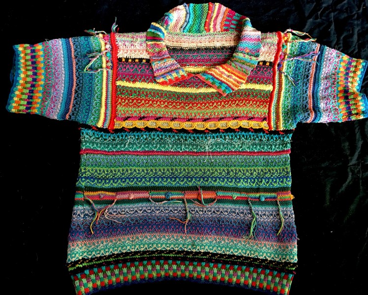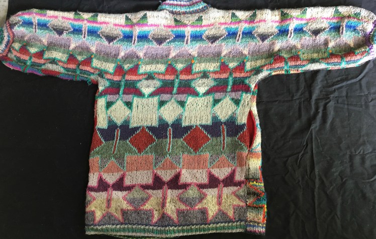 I was very proud of this work at the time. I remember my younger daughter, who was 5 years old at the time, sitting next to me on the couch and watching me knit it. I said to her, “This is what the inside of my brain looks like.” Hence the name of this blog and my Ravelry group, The Interior of My Brain. But a couple of decades later, I see things that I wish were different. That sequence of pink flowers has nothing to relate to and is just sitting there like a refugee from some different project. Also those three chunks of different patterns in the body don’t make sense together. They are too big. Their size seals them off from the other sections, and they don’t connect together. Connection is what makes the elements of a design work as a whole. The eye wants variety, but it wants coherence even more, and it wants variety to have a logic that serves coherence.
