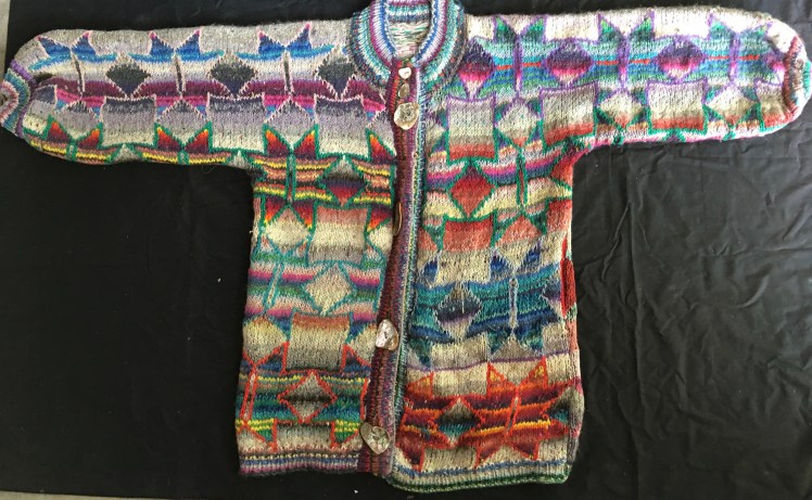 This child’s jacket, from 2010, narrowly avoided color disaster. It has an unusual construction that begins at the armpit, so I started with the green that has some gray mixed into it and the maroon red, then moved on to the periwinkle and muted orange. The colors had looked interesting together in a good way when I grouped them together in their skeins, but then broke out into open rebellion against me and each other when I got to the periwinkle and muted orange combination. The bright turquoise was the rescuing element because it brightened the periwinkle and complemented the muted orange. The orange/red multi that I used for the edging completed the rescue, by reinforcing the muted orange, maroon, and purple in the stranded areas, and doing that thing that orange does by soothing other colors’ relationships with each other. Orange is magic.