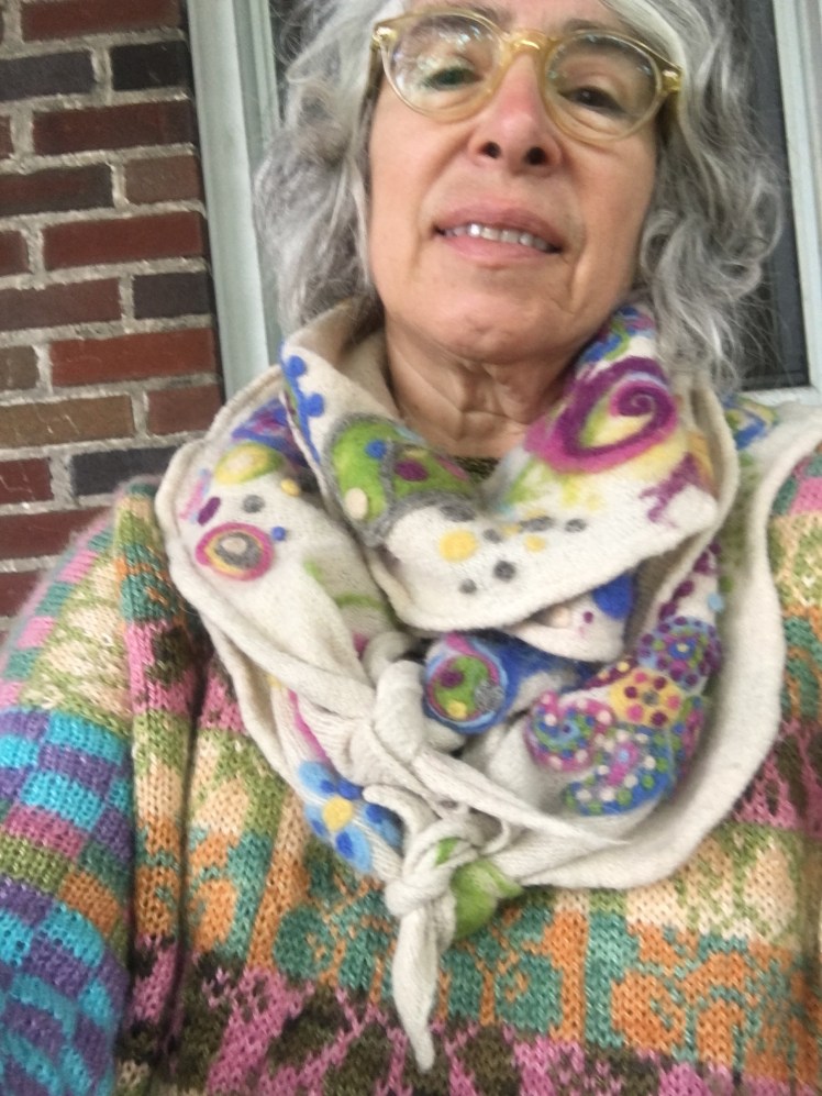 A couple of weeks ago I posted a selfie of myself wearing my newly completed pullover paired with a scarf I had needle-felted a couple of years ago, and I got some nice comments from a couple of people who have known me for a very long time.