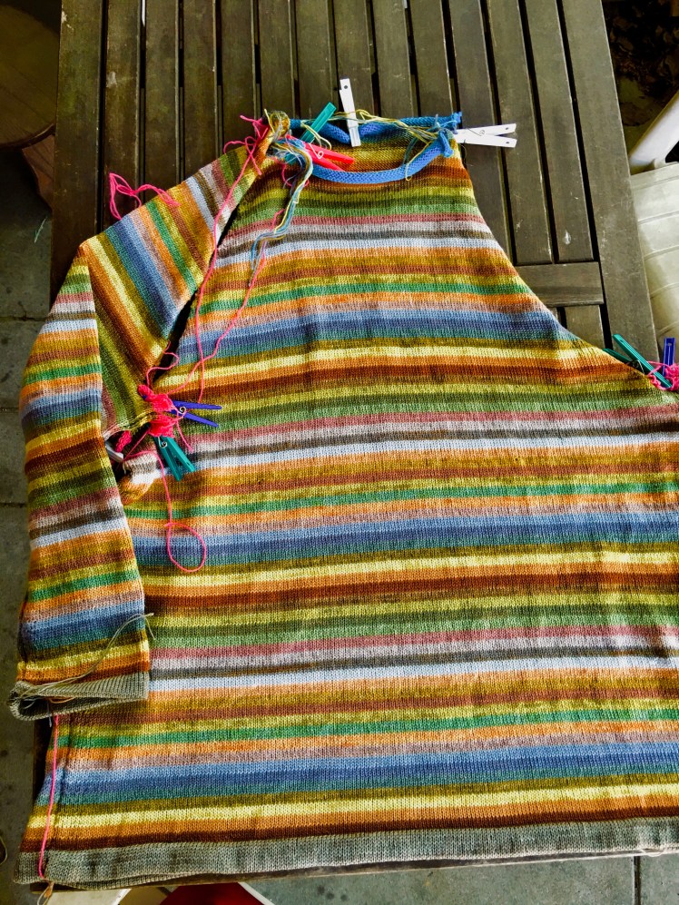 Having knitted very often with the yarn base I used for plant dyeing (Wollmeise lace), I already knew the gauge I would get from the tension I was planning to knit at: 15 stitches over two inches, 21 rows over two inches, at tension 7.0. Then I plugged my numbers into Elizabeth Zimmermann’s “EPS” (Elizabeth’s Percentage System), which is a set of equations that provide numbers for standard, classic garments, in proportions that work well on many kinds of bodies, including my husband’s, without modification. I’ve been using EPS as my go-to for years in my hand knitting (with modifications), so it wasn’t hard to adapt the system to machine knitting. EPS assumes knitting in the round, and my machine knitting is done is in flat pieces, so the resulting numbers are divided in half where appropriate, plus two stitches for the selvedge, one at either end. In order to get started on the knitting, I needed to know how many stitches to cast on, how many rows to knit to get to the armpits, and how many stitches to put on waste yarn for the armhole shaping. First I multiplied the chest measurement times stitch gauge to get what Elizabeth called the “key number”, 51 x 7.5 = 382.5, which I rounded up to 384 in order to cast on 192 stitches. Then I multiplied the garment length from hem to armpit by the row gauge, 17.5 inches x 10.5 = 183.75, rounded up to 186 to accommodate 10 rows of folded hem and a number of rows that was evenly divisible by four, for the 4-row stripes. According to EPS, the number of stitches at the armpits that need to be put on waste yarn is .8% of the key number at each armpit, 384 x .08 = 30.72. By the time I got to that point in the knitting, I decided to modify that number slightly.