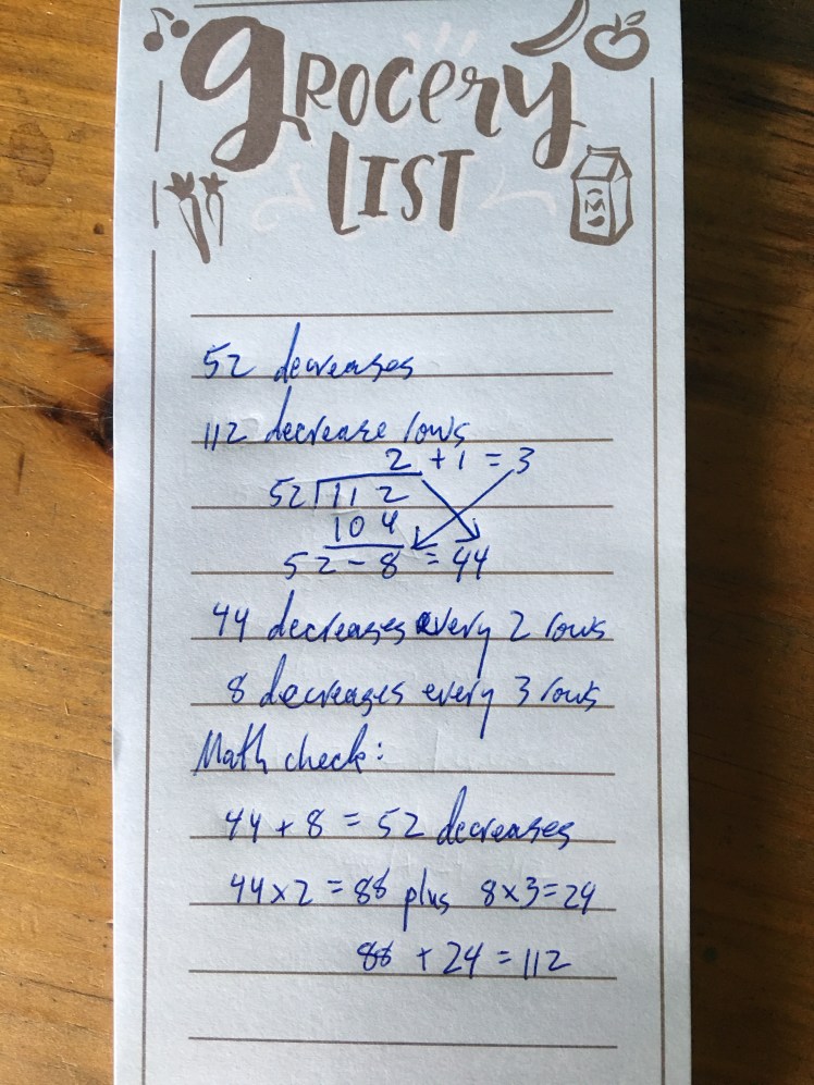 First, put away the calculator and do the arithmetic the way they taught you in 4th grade, on pencil and paper, because the calculator’s decimals won’t give you the information you need. The summary is, you’re dividing the number of decrease rows by the number of stitches you want to get rid of and then you multiply those two numbers together and subtract the sum from the number of rows to get the remainder. Since there’s a remainder, which isn’t a whole number, add 1 to the number you got as the answer to your division sum to make it a whole number. The remainder and the rounded-up number are the number of decreases and rows-apart for the number of stitchers that couldn’t be evenly divided. Then subtract the remainder from the number of stitches that need to be decreased. That number and the evenly divided number you got from the first calculation is the number of stitches you’re decreasing and how far apart they are. This set of calculations makes better sense when you do it for yourself, so I did it for myself using the numbers for my husband’s sweater: 52 decreases over 112 rows.