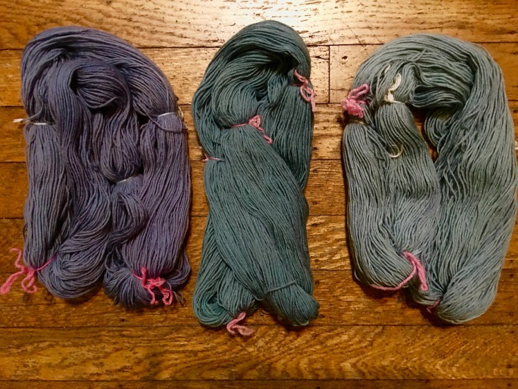 Once it was dry, it became a much lighter bluish-lavender gray. Not as thrilling but still nice. I put the skein through another dyeing or two using the same process to intensify the color, and I did that with three 2-ounce hanks. Now I have three slightly different hanks of bluish gray that looks like the color of the sky on a hazy day, or maybe it’s a lavender-adjacent gray, depending on the time of day and the lighting and what colors are nearby. All colors are mutable, and plant-dyed colors are so mutable that getting specific about what color they “really” are is a fool’s errand.