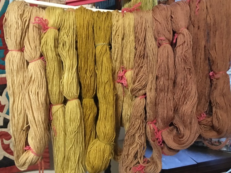 Next I put the fig trimmings through the same process, and got a pale yellow that was a little darker than what I got from the grape leaves. I knew fig leaves could do a lot better than that, so I collected another 20 or so leaves and made another bath. This time I got a strong ochre that thrilled my heart. I threw a couple of wishy-washy yellowish hanks into the exhaust bath, but either I had used up all the color in that first dyeing or the bath was going bad in my warm kitchen. The yellow may have gotten slightly more yellow in this dyeing, but it wasn’t very evident.