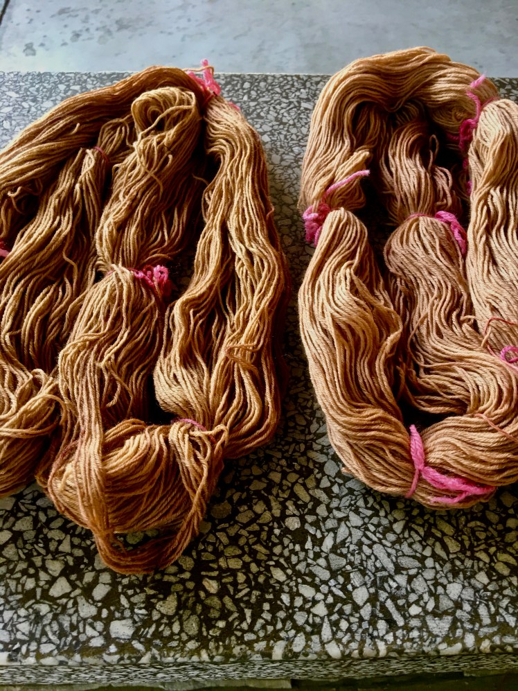 Finally it was the dead dahlia heads’ turn for a nice simmery bath. I had approximately two ounces of dried blossoms, and they started exuding color the moment I added hot tap water to the dye vat where they were waiting. I had high hopes for the bright orange Gwen had gotten, but I got a coppery brown very similar to the browns I get from avocado skins and stones. Gwen and Liz, both in the UK, get brighter colors from these plant materials, and one of the differences between their dyeing environment and mine is that their water comes from chalk aquifers. I did some research to try to find out the predominant minerals in our local water, and came away baffled. There appears to be some calcium in my water, but I don’t know how to compare it quantitatively to the water my British friends dye with. I have some more dead dahlia flowers for a future dyeing experiment and will add some calcium carbonate powder to that bath to see if I can stumble my way to replicating the conditions that give Liz and Gwen oranges when I get browns. I like browns. But I love orange. It’s an experiment to look forward to.