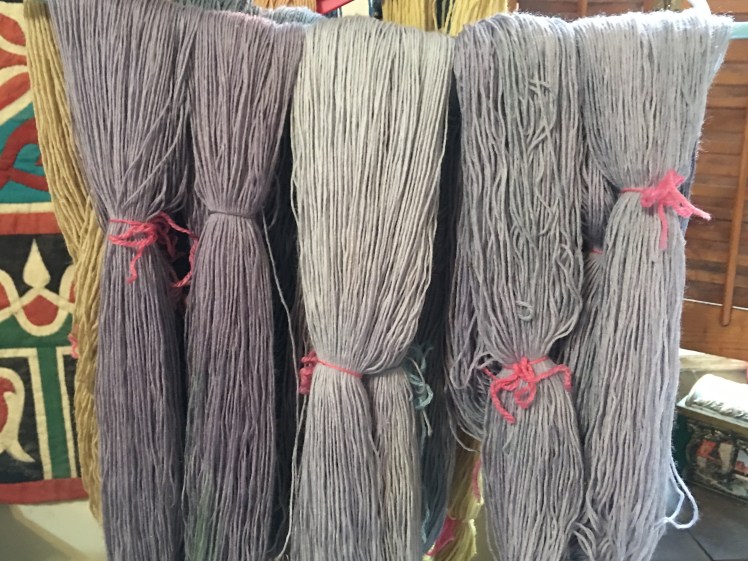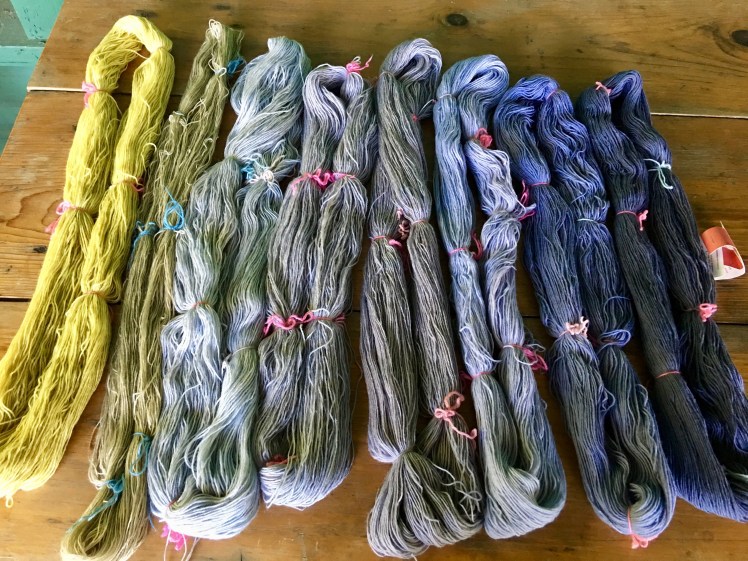 Normally I do a lot of plant-dyeing with foraged plants when I’m in Michigan. Sadly, this year was kind of a bust because spring had come late after a brutal winter, and the growing season was delayed by several weeks, so there didn’t seem to be much to dye with. I did find tansy fronds, and cut off a bagful of them and simmered them. I was hoping for the vivid green-yellow I had gotten in the past when the flowers were blooming, but I got a much weaker, somewhat muted yellow. Now I’m wishing I had thought to go and collect another batch of fronds and had re-dyed that hank.