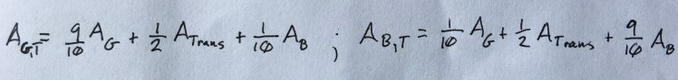 Step 4 is calculating the actual yarn use for the various ways I might have arranged the stripes. As Evan said, “Make a plan, check if it works.” My plan was to have the green stripes dominate the aqua stripes at an 18:2 ratio from hem to bust, and then flip that ratio in several steps until the aqua dominated the green at 2:18 up at the final two 20-row sequences toward the neck. Actually, there was only one way that needed to be checked, because as Evan and I talked and drew sketches, it became evident that there was only one acceptable plan, since there was room for only three transitional sequences between the top of the bust, where the green-dominant area ended, and the last two aqua-dominant sequences up at the neck. So the ratio for the green-dominant section was 9:1, the ratio for the transitional area was 1:1 because the reversal of the colors made the color usage equal, and the ratio for the aqua-dominant area was 1:9. Therefore, the area of the total number of green stitches equals nine-tenths of the area of the green-dominant section plus half the area of the transitional section plus one-tenth of the area of the blue-dominant section. The area of the total number of aqua stitches equals one-tenth the area of the stitches in the green-dominant section plus half the area of the stitches in the transitional section plus nine-tenths the area of the stitches in the aqua-dominant section. Here’s the equation that says exactly that: