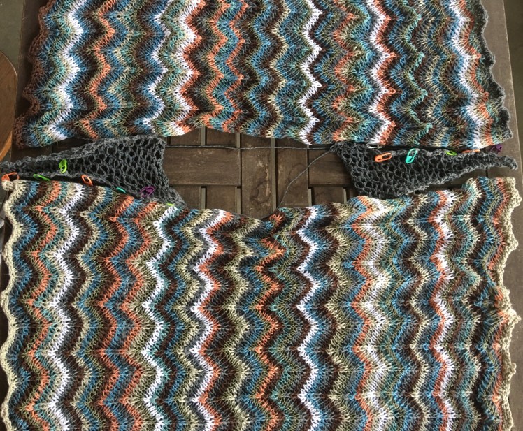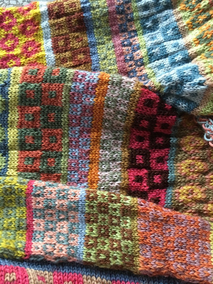 I knitted and knitted and knitted, and had fun combining my colors in various ways, sometimes emphasizing the differences between the colors and sometimes arranging them in gradients based on similarities in hue or value, then interrupting the gradients with the unlike colors. The flashes of white were like bolts of lightning. The knitting was fun, but there seemed to be an awful lot of it, and when I had finished the neck, I had ended up with a very wide neck. In fact, it was hard to keep the garment from slipping off my shoulders and even all the way off my body. It was also very long. I tried to live with the fit, but it’s not actually comfortable to wear. It’s baggy on me and I’m constantly putting the neck back onto my shoulders. My swatch lied to me. The garment grew way out of proportion to the size the swatch-based numbers I used should have given me. I suppose the sideways direction of the knitting stretched the stitch pattern lengthwise, and the fringe probably weighed it down as well. It’s a really pretty piece of knitting, but not on my body. So I’m treating this effort as a massively oversized swatch. I have enough yarn left over to reknit it in my true size, and I’ll cut back the number of stitches and rows based on the finished garment instead of my 5″x5″ swatch. When I have reknit it, I’ll give version 1.0 to a friend whose shape is better suited to it. Oh well. Stuff happens.