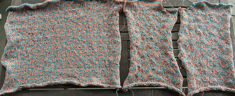 I will admit I flirted pretty hard with that line between success and not-success in using this color pairing with the mosaic stitch patterns I used for this project, which I found in Barbara Walker’s Mosaic Knitting book. I was looking for patterns that used the two colors equally in square shapes that took the eye in various directions but had enough space for each color to distinguish itself from the other, since different hues of similar value need patterning that gives each color enough space for each hue to be readable. There were a number of patterns that I wanted to try out, and as I swatched, my heart sunk. The colors were blending together in an undifferentiated fabric of holes and lumps. I couldn’t stop myself from picking at the stitches to try to even them out and show the pattern, and that helped me to feel that it wasn’t a lost cause, because the shapes of the squares started to meander over the swatches as they were supposed to do. I washed the swatches and pulled them firmly in all directions to make the stitches lie evenly and make the linen yarn bloom, which helped to fill in the holes. The swatches looked pretty interesting in real life. The patterning came in and out of focus depending on the lighting and angle. But photographing them was a challenge that almost scuttled the project. Nevertheless my friend Melissa (the yarn store owner who I mention all the time) told me to just trust her, it was going to be fine. So I knitted on through my ambivalence.