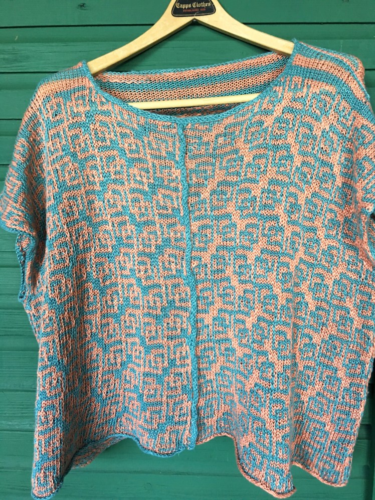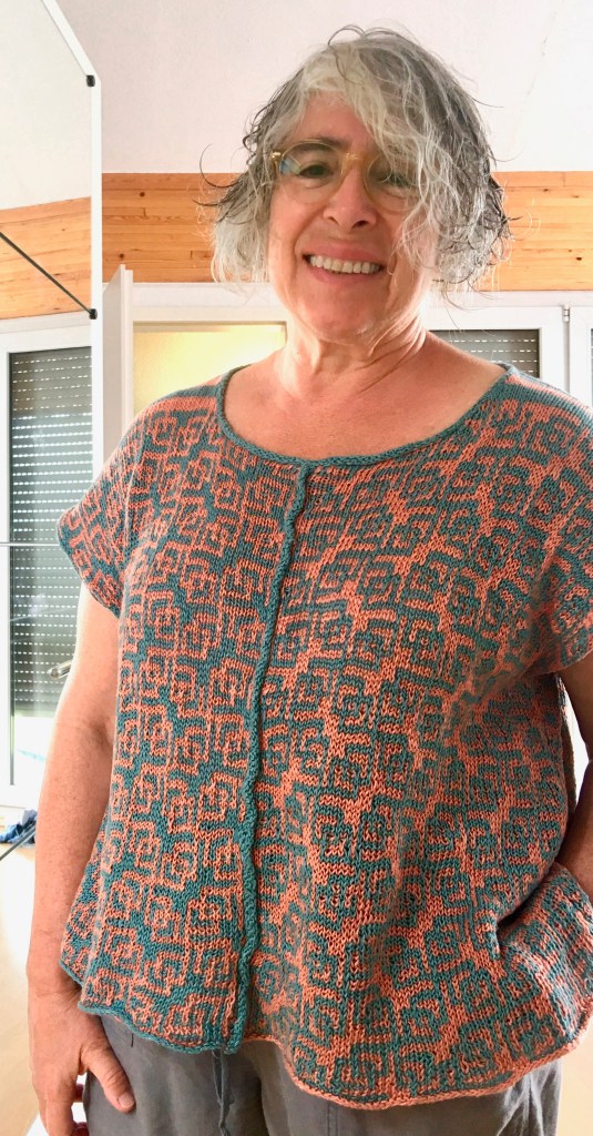 My summer knitting was based on squares, both the shape of the garments and the patterning of the fabric. I feel very comfortable in dropped shoulder boxy shapes with a slope at the shoulder seam formed by adding a stitch or a row, depending on the direction of the knitting, at inch intervals to build a wedge from the point of the shoulder to the nape of the neck. Oversized dropped shoulder garments of the ’80’s and ’90’s deserved their bad reputation because they made the bodies underneath look lumpy and bumpy, but the simple trick of sloping the shoulders enables the fabric to glide over the bumps of the body that are supposed to be there while speaking not of the lumps that one wishes were not there. If you use the shape in a summer garment without sleeves, the shoulder slope whittles down the width of the fabric that extends beyond the shoulder point so that it conforms to the shape of the upper arm. So a boxy dropped shoulder shape without sleeves was the template into which I plugged fiber, color, and patterning. I had two garments planned for my summer hand knitting.