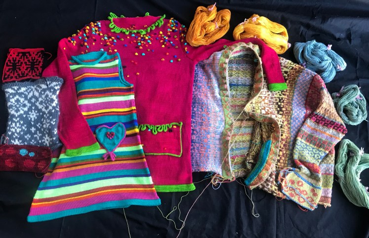This month’s post is a show-and-tell minus the tell, because I’m up to my ears in not-ready-for-primetime projects. I try to manage my crafted production so that I have something finished and ready to blog about in detail every month, but this month threatens to go by without a post. Not because I have been lying in bed eating bonbons and doing nothing, which actually sounds rather delightful, but because I’m in product knitter mode again, working against the clock, while working on a massive hand knitting project and trying to keep up with swatching for January 2020 Swatchathon. And trying to write a post that distills the essential elements of my creative process as a kind of prospectus for formal talks I might someday deliver. Not a quick and easy write. Eventually there will be at least three blog posts coming from the projects I am working on right now, but for now, a quick-and-dirty post with scruffy progress pictures will have to do.