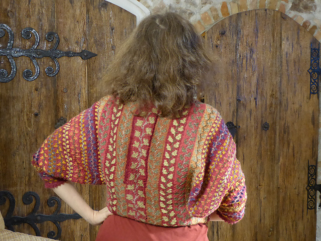 Then she sewed the fronts to the rest of the jacket. I’m not sure if she bound off the front stitches that she was holding on a needle while she worked the backs or if she joined the live stitches with the separately knitted front pieces. After the pieces were joined together, she picked up stitches, up one side of the front and around to the back, where she corrected the excessive width of the back by spacing her picked up stitches fairly widely apart and then decreasing stitches to gather the fabric in so that it would fit her shoulders and not fall off her body. Johanna had dealt with the same problem also by gathering in the excess width in stitches picked up for the final band of stranded knitting that traveled up one front triangle, across the back, and down the other front front triangle.