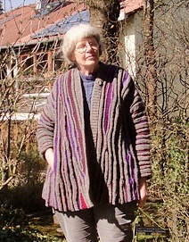 Our member Johanna, a prolific knitter, spinner, natural dyer, weaver, and all-around Renaissance woman from Vienna, Austria, presented a jacket made of her natural-dyed yarn for our rapturous admiration: