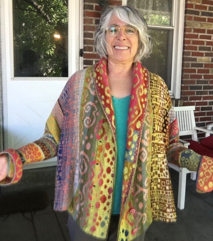 The Johanna’s Jacket KAL started without a pattern or even any real definition of what qualifies as a Johanna’s Jacket. We all took elements from her jacket that we interpreted according to our own personal styles and preferences. Some of us chose to knit stranded patterns as Johanna did, and a couple of us even used one or more of Johanna’s motifs. We all started from the sleeves and built our jackets from the sleeves with at least some side-to-side construction that joined the two sides at the back, although none of us emulated Johanna’s diagonal construction of the fronts, and all of us went our own way in our construction of the fronts and the way we joined the two sides at the back. The one common element among all of the jackets is the sideways construction growing out of the sleeves. But if a knitter decided to make a Johanna’s Jacket based on some other element of Johanna’s design, or went through our thread and found something in one of the second-generation jackets that Johanna didn’t do but which was inspired by Johanna, who am I to say that it’s not a Johanna’s Jacket? As I said at the beginning of this post, I’m all for anything that sparks creativity and original problem-solving.