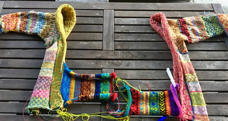 While I was slowly knitting through my plan, Giselheid, a knitter in Munich, Germany, came up with her own interpretation. Like the rest of us, she started her jacket at the cuffs and knitted her sleeves first, with some increases at the armpit to ease the transition from sleeve to body length. We all did that. Giselheid’s increases seem to have been done at the underarm seam line, starting a few inches down from the armpit, which created a straight line between between the end of the sleeve and the start of the body. Then she knitted a strip the length of the side of the garment down to the hem, attached it to the armpit, and knitted the fronts side-to-side, and then the backs, which she sewed together. The broad strokes of Giselheid’s construction method was generally similar to the approach the rest of us took. However, her jacket looked strikingly different from the rest of ours. Giselheid’s style is deconstructed, with a close fit at the upper body, flowing into a generous A-line at the hem, and unlike the rest of us whose color work was stranded or slipped stitches, she used stripes, short rows, and welts to make irregularly shaped purples and reds pulsate out of a stone gray main color in stripes and wedges that looked accidental-on-purpose. We had some discussion at one point about doing a KAL using Giselheid’s oeuvre as an inspiration, because of the inventiveness of her construction methods, her use of texture and short rows, and the deceptive simplicity of her designs. One of these days I’m going to revive that idea. The Interior of My Brain Knits Giselheid! It’s going to be brilliant!