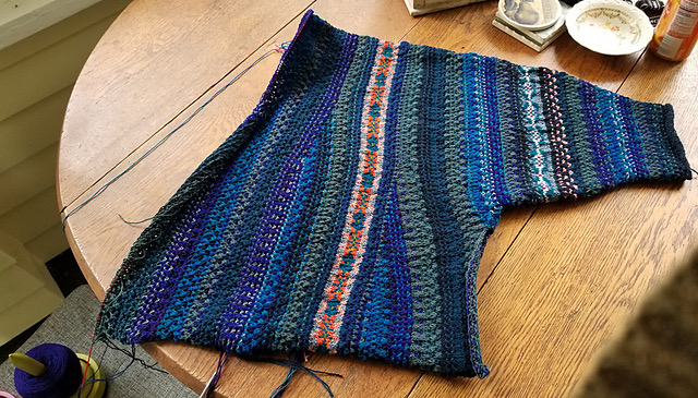Dorothea had to interrupt her progress because she had an injury that knitting exacerbated, but she knitted both sleeves and the backs, which she joined together for a short, fitted dirndl-like jacket. When she stopped, she was pondering how to knit the fronts. I am avidly awaiting her solution, whenever her body allows her to get back to her jacket.