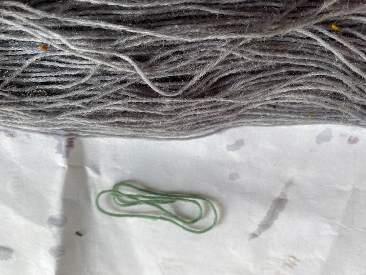 I collected 8.65 ounces of black-eyed Susan flower heads, petals and eyes, and simmered them for about an hour and a half, then put in 2 ounces of mordanted yarn. I was expecting to get a deep khaki green, and I got it. That reassured me that the Wool2Dye4 name wasn’t a misnomer. The exhaust bath gave me a lighter greenish gray. Or in other lights, a grayish green. Then I threw the Jerusalem artichoke failure into the second exhaust, because why not? It was about as sad a color as I was likely to get. The exhaust bath was pretty exhausted, and it came out a slightly greener version of the brownish-yellow, which was a slight improvement but nothing to keep me from acting on my impulse to find out what would happen if I put it into a baking soda solution after-bath. Abracadabra! That spoonful of magic powder transformed the pallid green-brown-yellow into vivid apple green before my very eyes. It turned failure into something beautiful and exciting.
