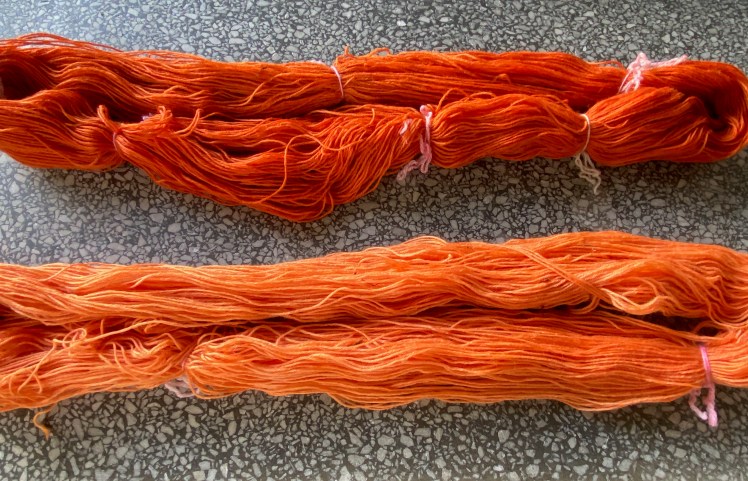 I went out and collected another 2 ounces of coreopsis flower heads and put 2 ounces of mordanted yarn into the prepared bath. When the yarn was a lovely deep yellow, I dissolved a teaspoon of baking soda in a bowl of tap water, at pH 8, squeezed the dye water from the hank and picked out the flower bits, and threw it into the baking soda bath. It instantly turned vermilion, so I took it out of the bath and let it dry. Another prepared 2-ounce hank went into the exhaust bath until it turned a sunny medium yellow, and it went into the same baking soda solution that I had used before. It quickly turned a bright orange. Of course the wet yarn was going to dry a couple of shades lighter than the blazing colors that came straight out of the after-bath, but my burning question was whether this after-bath would play that cruel trick that other alkaline modifiers have broken my heart with, and wash away all of the color when I washed the yarn in water and pH-neutral detergent. I let the yarn sit for a few days to let the color set, then washed the hanks: the washing water turned orange, but in the end there was minimal color loss. So maybe the stability of the color was because the color from coreopsis is intrinsically fast, or maybe it’s some characteristic of the solution of the baking soda in the water that I’m not scientifically learned enough to identify.