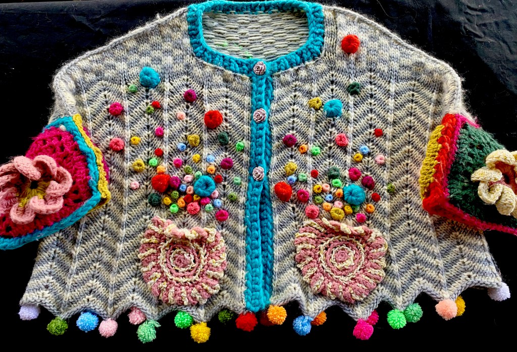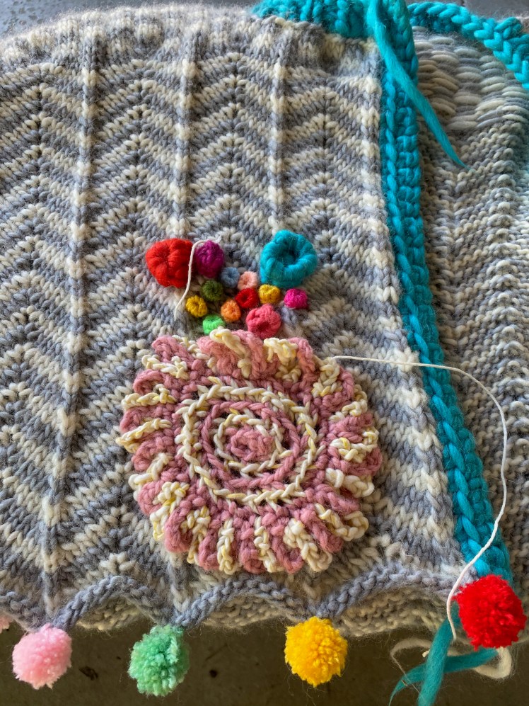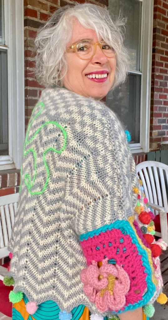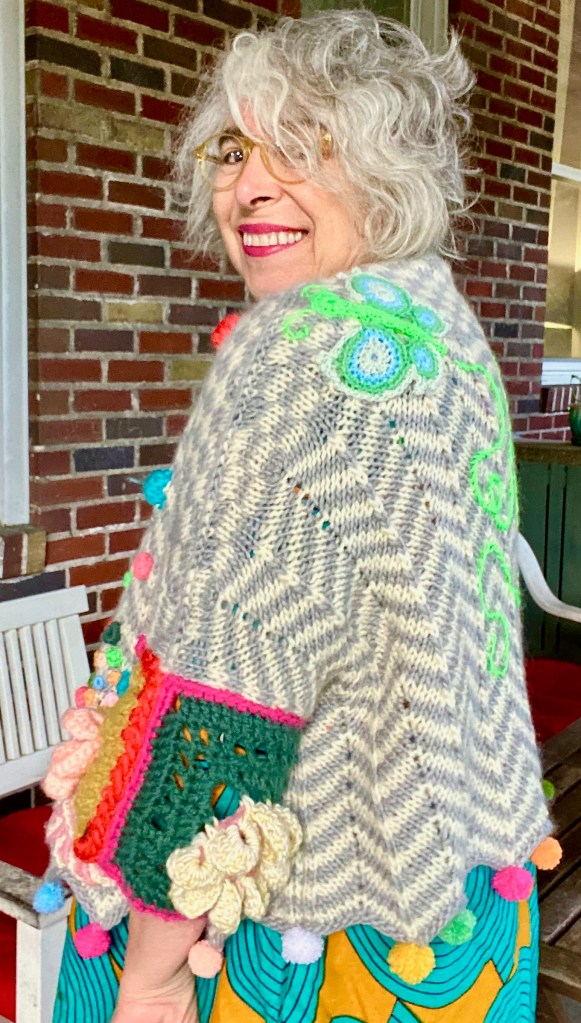 Like a lot of my work, this design is not exactly minimalist, and those who find color vulgar and prefer the understatement of choosing one theme and sticking to it will probably not love what I have done here. There are a lot of elements in this design: zigzag striping in white and gray that morphs to a checkerboard in the knitted base of the body; large crocheted squares with floppy flower centers in bright and purposely varying color combinations; a crocheted circular pink and white motif for the pockets; bright-colored pompoms at the points of the zigzag hem positioned without a rota; crocheted dots repeating the colors of the pompoms and sleeve motifs, in various sizes and distributed with intentional randomness; vivid turquoise button band and neck band; dusty pink rose-shaped buttons; blue-green gradient butterfly; lime-green curvilinear embroidery. It could have been chaotic. I don’t think it is.
