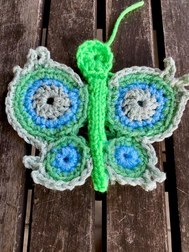 I thought this jacket would be a good vehicle for a crocheted butterfly appliqué that I devised about a year and a half ago to cover a burn hole. I couldn’t remember how I had done it, so I went back to the instructions I wrote in the blog post about the chain of disasters that required a crocheted butterfly patch. I published the post as a pattern on Ravelry, and someone made the butterfly and told me I had made a mistake in writing the directions. I had a crocheter friend take a look at my instructions, and she said they were clear and accurate, so I didn’t make any changes. When I made the butterfly for this jacket, I had so completely forgotten how to do it that it was as if someone else had written the pattern, so I followed the pattern as if I had never seen it before, without any problems at all.