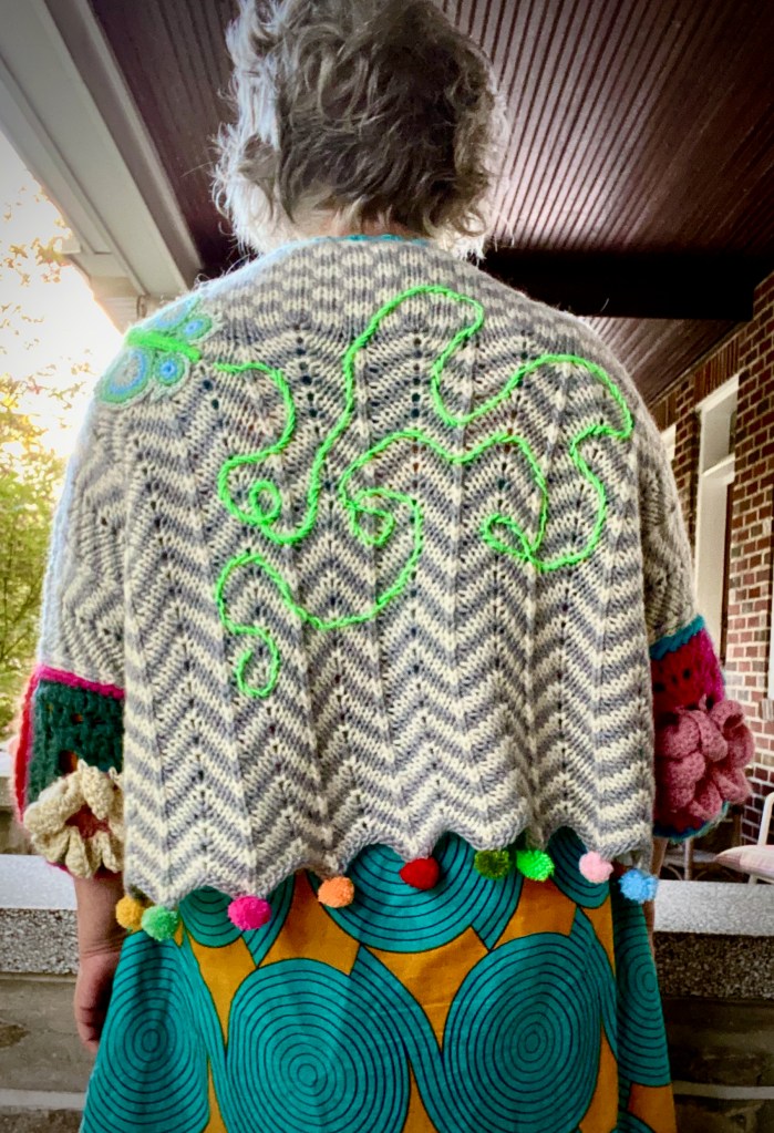 I had originally hoped to put the butterfly on the front, but it was too big for the available space, so I put it on the back and let it dominate that space, with a day-glow green looping flight track wandering all over the back. The turquoise button band and neck band repeat the turquoise in the big crocheted dots, and turquoise has an affinity with gray and white. The dusty pink ceramic buttons refer to the pockets in color and shape. The flowers of the sleeves have a similarity to the pockets because of their circular centers and the radiating petal shapes.