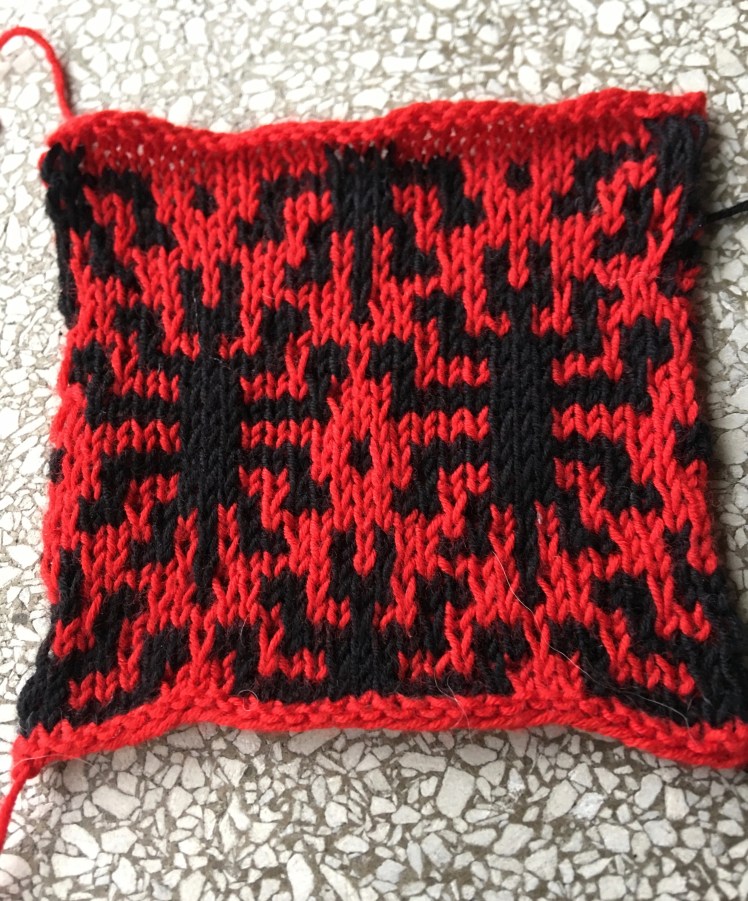 Then I made a decision that cost me months. I started to worry that I wouldn’t have enough of the red yarn and I felt a need to conserve it. I also hadn’t settled on exactly how I was going to do the upper body, where I would need to shape it around the shoulders and enable a head and arms to get in and out of it. However, I did have a black-white-gray multi in Wollmeise DK and dark red Wollmeise DK, and I thought that I would reprise these two yarns in the yoke somehow. I don’t usually like ribbing, and I decided to avoid a 1X1 ribbing by knitting the black-white-gray multi in garter stitch punctuated by slipped stitch bumps in dark red.