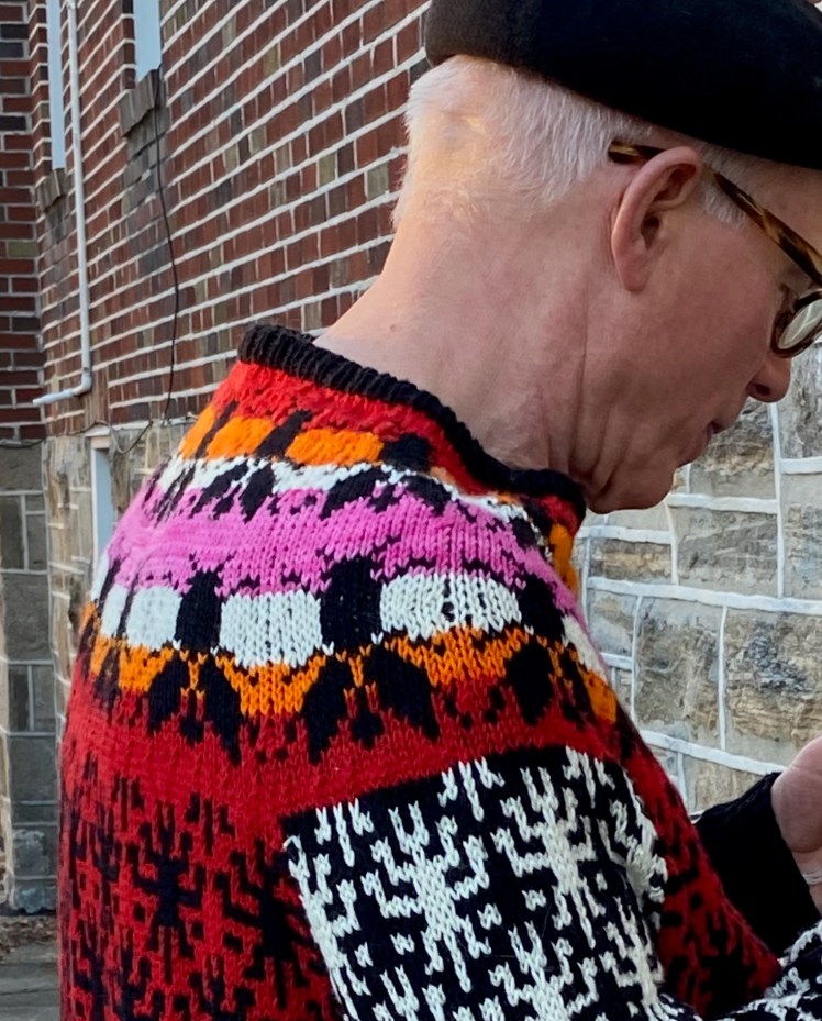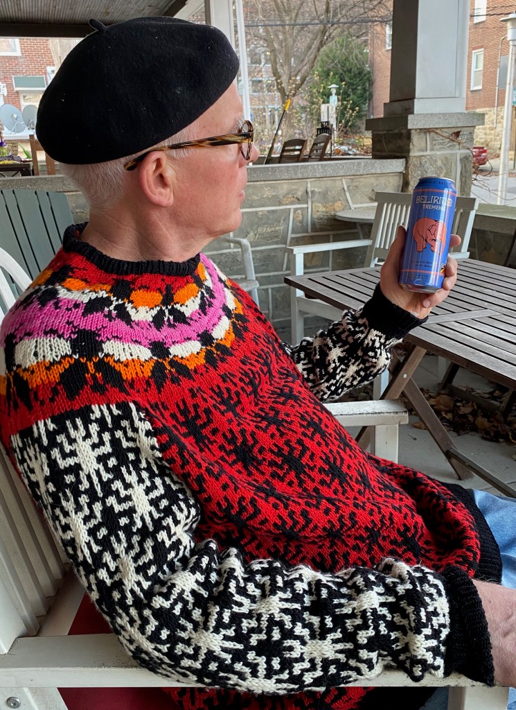 As I was knitting, I was having qualms about the size and fit. My husband is a man of average proportions, and this looked as if it was going to be a circus tent, especially since the gauge was pretty loose and the yarn is prone to stretching way beyond what a gauge swatch will indicate after the work exceeds a certain weight. Also the yoke decreases in the stranded flies were producing an odd funnel shape, and I had fears of the upper yoke bunching up around Charles’ ears because it wasn’t wide enough to fit over his shoulders. When I finished the knitting but before I blocked it, I made Charles put it on, even though I knew that was a mistake because I always hate the way everything looks before it’s blocked, and sure enough, it looked terrible. I told Melissa it looked terrible, and she laughed at me because I always say my unblocked garments look terrible. I do that every time for the reassurance of getting her to laugh at me for doing what I always do, as if we are both following a kabuki script. So I blocked it. It fits him generously, but the hem isn’t at his knees and the sleeve cuffs don’t drag on the ground when he walks, and the yoke conforms to the shape of his shoulders when the shoulders are inside the yoke. It functions as the warm comfortable sweater it was intended to be.