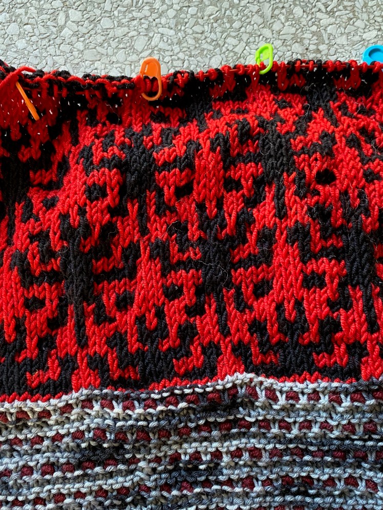 This time, when I knitted the black bugs on the red background, the pattern took root readily and I moved along toward the armpits at a pretty good clip. I think that became possible because I had a heart-to-heart with the white-black-gray multi and we mutually decided that it could stay where it was until everything else was done, but then it was going to have to go. As I knitted, I came to the conclusion that the edging that would best serve the appearance and function of the sweater would be the deadly boring 1×1 ribbing that I avoid whenever I can. I made my peace with 1×1 ribbing in the black yarn, since I had plenty of it.