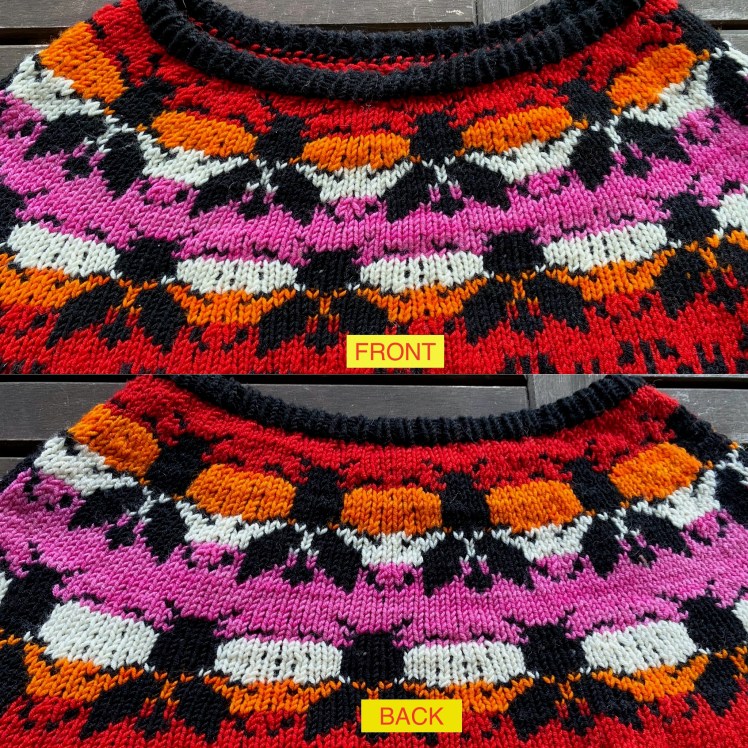 After the raglan decreases, I had 288 stitches (a really good number because it’s divisible by many multiples of 2 and 3), and I was at the halfway point between the armpits and the neck. A quarter of those stitches needed to go before I started the flies. First I worked the first set of short rows in a round of plain knitting between the end of the mosaic knitting and the start of the stranded knitting, and then I decreased 25% of the stitches on the needle, and that fortuitous number, 288, enabled me to do a brainless knit-2-knit-2-together decrease all the way around, which resulted in another fortuitous number, 216 stitches. The neck needed to be somewhere between 80 and 100 stitches. The chart for the flies was 17 stitches wide and 22 rows high. I needed two pattern repetitions for the length to the throat and 10 additional rows for the length at the back of the neck, which would shape the neckline. There were plain rows at the beginning and the end of the chart, so each of those plain areas was an opportunity for a set of short rows, and that gave me three places for short rows, at the bottom of the first set of flies, at the start of the second chart repetition, and at the end of the second chart repetition. I needed two more places where I could put in extra rows without messing up the shape of the fly too badly, and I found a place in the chart where there were three identical rows in the body of the fly. A set of short rows would make the thorax of the fly two rows longer, which isn’t hard on the eye. Or on the knitter. Two reps of the chart gave me the two additional short row opportunities, so that was 10 additional rows to raise the back of the neck and cover my husband’s crazy long back.