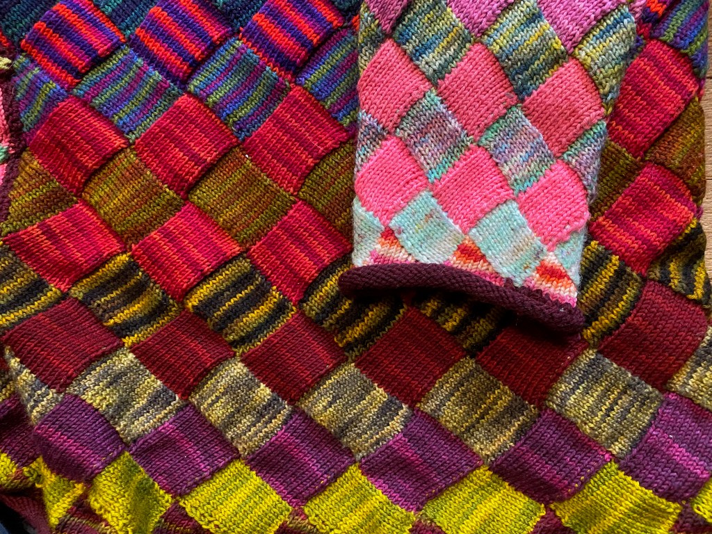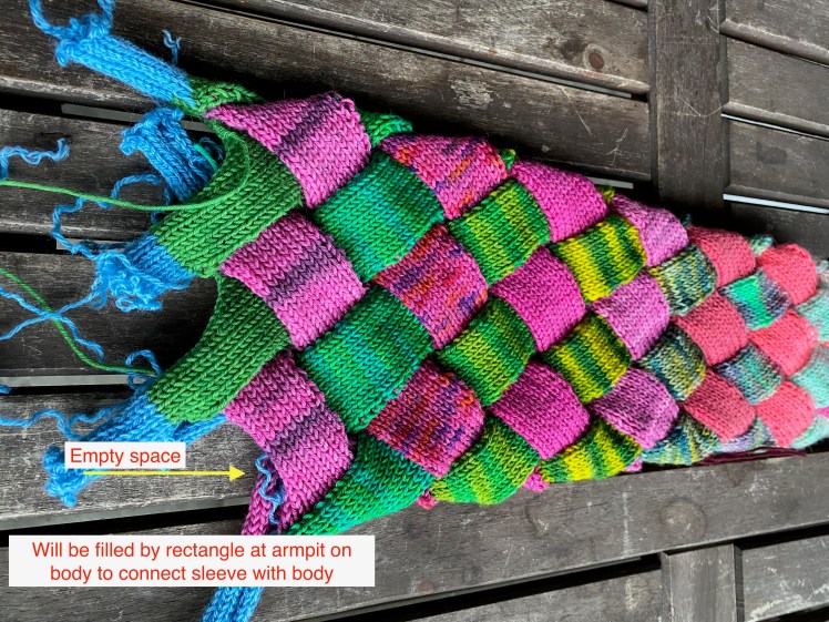 While I was knitting the body, I had started visualizing how to join the sleeves to the body at the armpits. What was needed was entrelac rectangles connecting the body with the sleeves, so the body and the sleeve would share these bridging rectangles, one half of the rectangle (or rectangles, I used two) on the body side and the other half on the sleeve side. The more efficient way to do it would have been to have left two rectangles unknitted at the right side of the body and two on the left side, and then filled in those holes during the final sequence of the sleeves by knitting the rectangles in the gap on the body and joining them with the stitches of the sleeve at the armpit. But I didn’t do it that way, because when I was at that stage of the body, I wasn’t yet ready to commit to doing that. I needed the pieces I was going to fit into each other to be physical realities rather than theoretical concepts so that I didn’t put the sleeves in the wrong part of the body or some other theory-crashes-into-reality miscalculation. So I knitted the final row of the sleeve with two fewer rectangles to form the hole into which the two bridging rectangles from the body would be sewn in. Sewing in the rectangles took a bit of extra time and effort, but the join at the armpit is indistinguishable from any other part of the fabric.