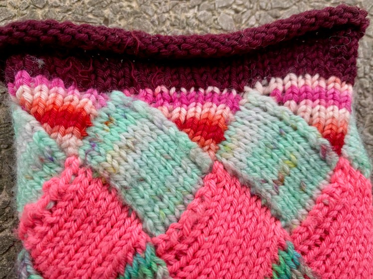 I saw it once on Facebook in a machine-knitting group and then never saw it again, but it burned a hole in my imagination: a yoked all-over entrelac pullover in gradients of green and pink. It sparked my year of machine-knit entrelac, which occupied my knitting machine for a lot of 2020. I mentioned this pink-dominant entrelac work in my Ravelry group, and as usual, my brain trust provided me with links to videos that showed the method. One of them was a YouTube video in which the machine-knitting goddess Diana Sullivan demonstrated how to make an entrelac cover for a round cushion, with large entrelac diamonds decreasing to small ones that gathered up in a star shape in the center. Diana used scrap yarn to hold the live stitches on each entrelac rectangle, and it looked like a confusing mess to me. I wasn’t ready for that yet.