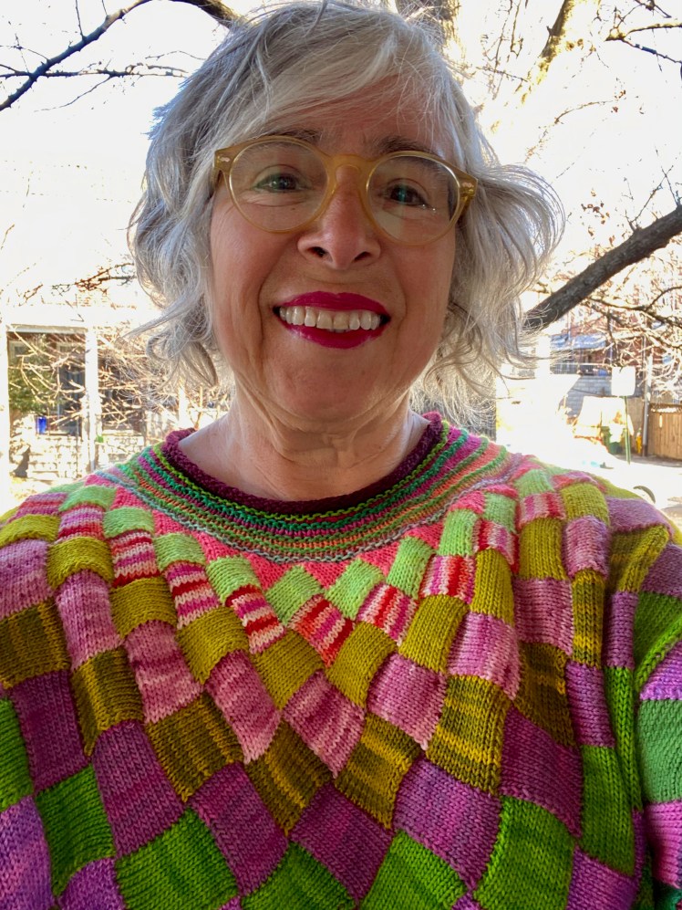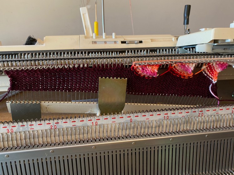 I had spent months, the entire duration of the long-drawn-out process of knitting the body and then the sleeves, trying to visualize how to make elongated rectangles at the back of the yoke that would fill the function of short-rowed neck shaping, but I couldn’t figure out how I would then decrease the size of the rectangles of the following row in order to shape the yoke. Maybe there’s a way to carry out these apparently mutually exclusive operations, but I couldn’t find it, so I punted. I waited until the very end to shape the neck and complete the yoke. At my level of machine-knitting skill, hand-knitting is much more nimble and efficient for decreasing in the round than machine-knitting, which requires moving all the stitches on the needle bed in order to do decreases on stitches in the middle of the array of needles and seaming the fabric knitted on a single bed. Theoretically, one can knit in the round by using the ribber, but I don’t know how to do that. But hand-knitting is my native language, so I used light, bright colors, pinks in stockinette and lines of garter stitch in greens to delineate the short-row shaping segments and to hide the final decreases that drew in the yoke and avoided draftiness of a too-open neck. Then I put half of the stitches back on the machine to knit a rolled edge, cast off (too tightly and had to redo it by hand), and did the same on the other half of the stitches. After I had a neck edge that would fit over my head, I seamed the two halves together, not invisibly and not accurately placed, but I’ll live with it.