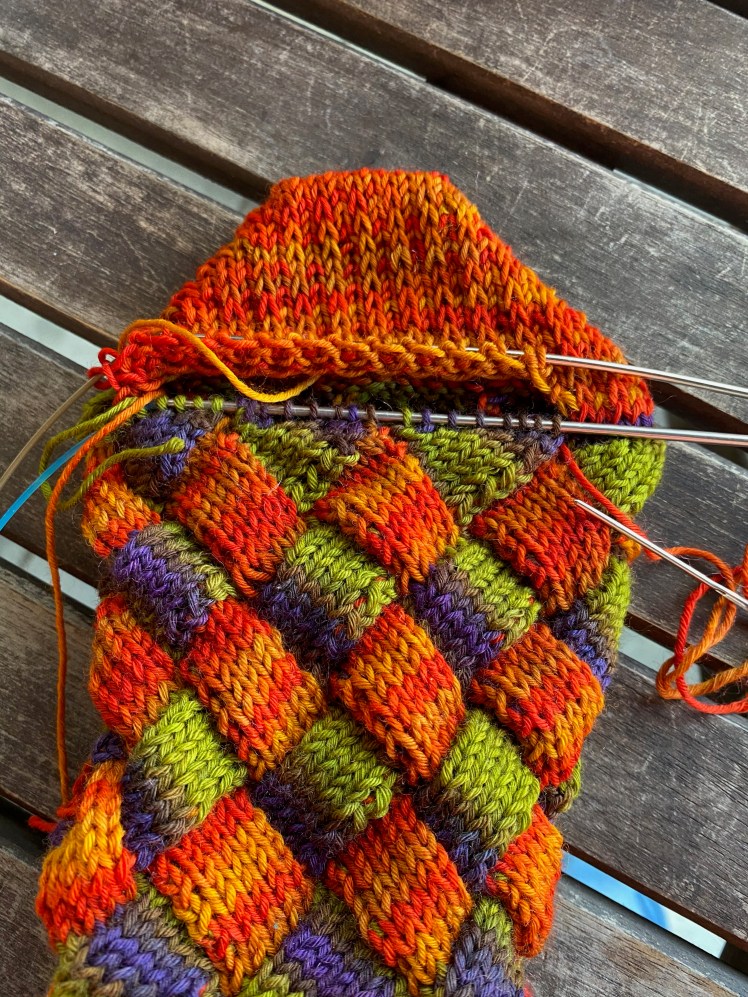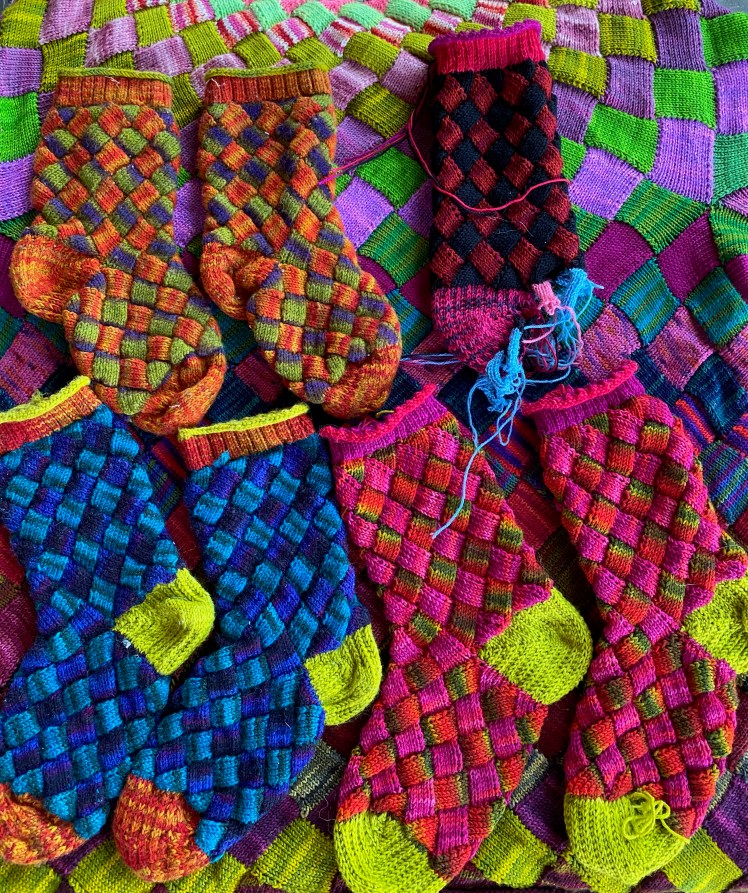 As the photos show, I have made three pairs with a fourth pair now on the machine. The prototype is the green and orange pair, which showed me that my numbers and construction method were good and produced a comfortable and serviceable pair of socks, but the fit needed some tweaking. They were short and wide and looked, a friend told me, like mukluks, which made me wince because of the ill-fitting foot-bags that started this adventure. They fit comfortably in shoes because I knitted them on a relatively loose tension (7.0 for the entrelac and 8.0 for the ribbing, heel, and toe) that allows them to stretch to fit the length of my foot, but for the second pair, I added an additional full diamond sequence to both the leg and foot and tightened the tension a click, 6.2 for the entrelac and 7.1 for the rest. Then I thought the second pair was still a little loose, so I tightened the tension by another click for the third pair, 6.1 for the entrelac and 7.0 for everything else. The third pair is perfect for me. The fourth pair, now in progress, is Charles’ birthday present. The second pair fit him nicely before I put in the toe, so I will use the same numbers and tension and add some more sequences to the length of the leg and foot, probably about 3″.