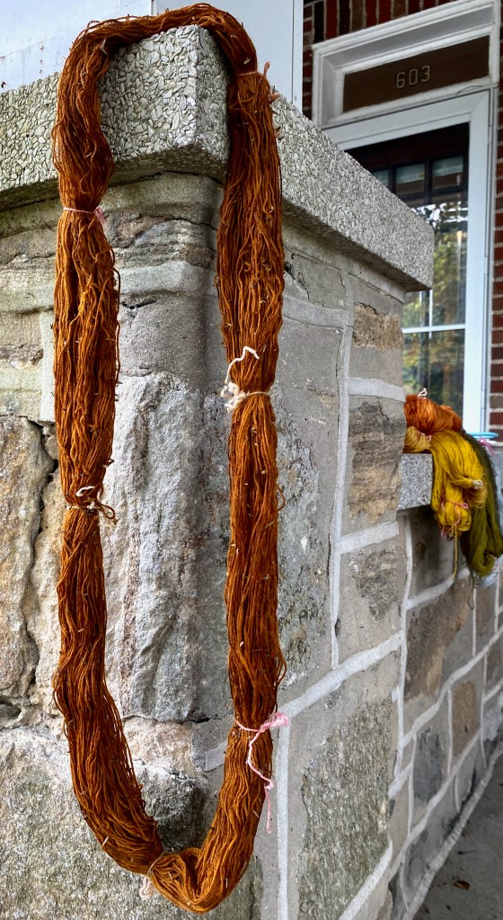 For my first couple of years of dyeing yarn using foraged local plant materials, a good true orange was the color I craved and never achieved. It took me a while to realize that the fulfillment of my desires was in the trash and the pantry. I have written about the magic transformation I get from dunking a dyed hank in a bowl of water with a teaspoon or so of baking soda dissolved in it (A Spoonful of Magic Powder), and experience is showing me that it’s a reliable way to turn yellow plant dyes into vivid oranges, depending on how much pigment is in the yarn. A strong yellow will turn orange, a muddy pale yellow will get brighter.