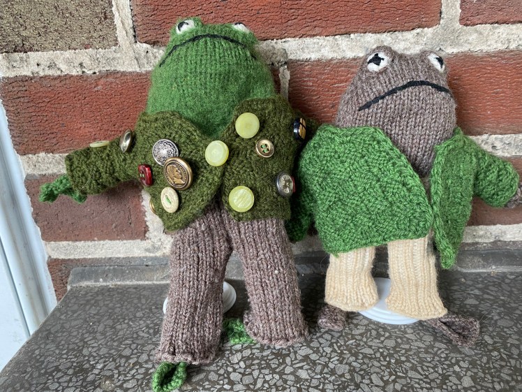 I have four main colors for the items in the Frog and Toad pattern by Kristina McGowan, white, deep green, ochre/brown, and brown/gray, and they are very close to the colors in the illustrations of Arnold Lobel’s stories. I’ve been knitting lots and lots of accessories for Frog and Toad World, and I’ve tried to stay within the palette of the illustrations. I wanted to make trousers for Toad, and the illustrations showed him wearing tan trousers, but I only had bright white yarn. So I after knitting his tiny trousers, I plunked them into a bath made from used tea bags and let them sit there for a day, and they came out the perfect color. No mordanting, because tea has tannins. Then I made the jacket whose lost button caused Toad such a meltdown that afterward he was ashamed of himself and sewed on all of the buttons that everyone had found for him and gave the jacket to Frog as a gift. The problem was that the jacket was knitted in the same green I used for Frog and I didn’t want the jacket to look like an extension of Frog’s body. So I found a tannin-rich solution to the problem, which was the green-hulled walnuts that are falling from the trees at this time of year. I picked up about a dozen of them in the park and cooked them up in a bath, in which the jacket spent a day and darkened to a rich forest green that was distinctly different from the green of Frog’s body.