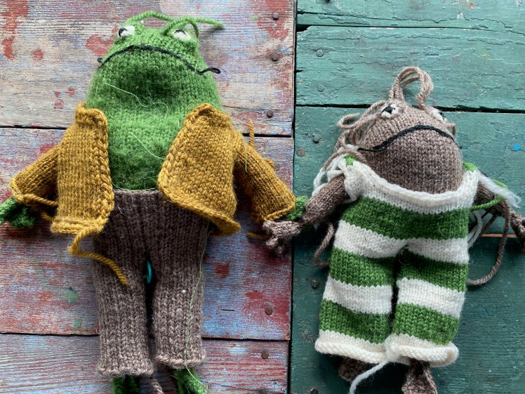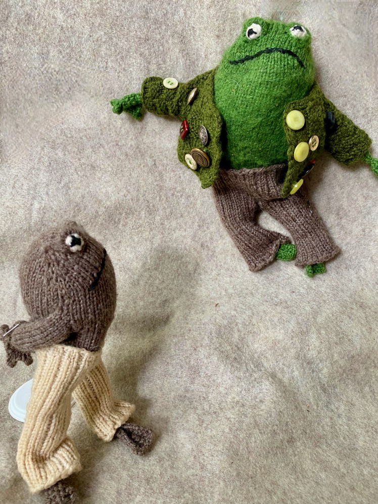 I had aged out of Arnold Lobel’s Frog and Toad books by the time they were published in the 1970’s, so they were a delightful new discovery when my husband and I came across them during our daughters’ early childhood at the beginning of the 1990’s. I remember we even had a VHS tape of the stories, which transfixed all of us in mesmerized sedation, with Lobel’s simple sentences, illustrations drawn in a unified neutral palette, and sweet tales of friendship between anthropomorphized amphibians. Our now-grown daughter relives this happy childhood experience with her own children. Knitted toys are not my thing, but Kristina Ingrid McGowan wrote a detailed pattern for Frog and Toad that completely captured the look and personalities of the characters, and, in an out-of-body experience because it’s so very not what I do, I got the pattern and began to study it.