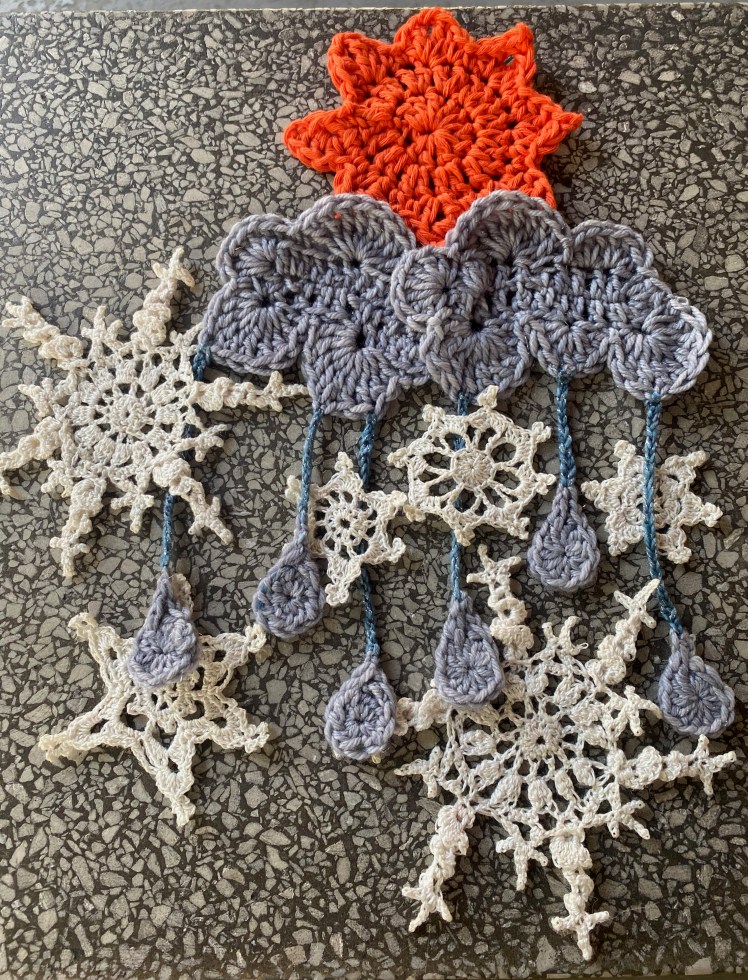 Having accomplished the snowy weather, next up was rainy weather. Melissa had given me an odd skein of gray worsted yarn with a silver lurex thread shot through it. I began seeing it as a raincloud. At first I thought about making a multilayered combination of shell-shaped textured crocheted bullions, but I couldn’t readily make it work and wasn’t committed enough to the idea to keep trying. There are much easier ways to get the idea across, and I found a free pattern for clouds and raindrops on the GoldenLucyCrafts.com website. I didn’t follow the instructions accurately but was satisfied with the asymmetric result since clouds are asymmetrical, and made another cloud that was asymmetric in a different way. Attached together, they represented a very plausible storm cloud. I puzzled a bit about whether I should make raindrops, because these little bits of unattached crocheting would be impossible to keep track of. Then I remembered that back in the spring, I had bought some blue-gray fingering weight yarn with a ply of shiny lurex because I’m planning another blizzard sweater. I decided to attach raindrops to the raincloud with that yarn in crocheted chains of different lengths, and the result looks pretty rainy.
