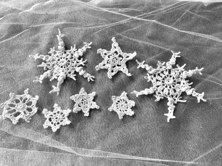 I consider myself much more a hand-knitter than a crocheter, but in this project I enjoyed the crocheting much more than the knitting. The reward for grimly soldiering through the knitting of Frog and Toad and their clothing was crocheting fun little items for the weather in Frog and Toad World. Somewhere along my descent through the rabbit hole I had begun seeing them in overcoats, scarves, and hats for the sledding adventure that Frog dragged Toad out of bed to join him on. That meant that snowflakes were required. I had some very thin white cotton yarn inherited from a former weaver that would make lovely delicate snowflakes. Melissa had a tiny size 10 crochet hook lying around, because people give her their mothers’ old crafting tools when they’re cleaning out their houses and moving them into assisted living. So this pairing of items inherited from past generations came together to make crocheted snowflakes for Frog and Toad World. Of all the many components of Frog and Toad World, the snowflakes were the most enjoyable part. I had never crocheted such fine yarn on such a tiny hook, but the focus required to aim the hook into tiny holes and pull the tiny yarn through the tiny holes transported me to a transcendent state of consciousness. Even the simple and basic snowflake patterns I used looked etherial in this thread-like yarn. Then I stumbled over a free pattern by Svetlana Rogatykh that made my jaw drop.
