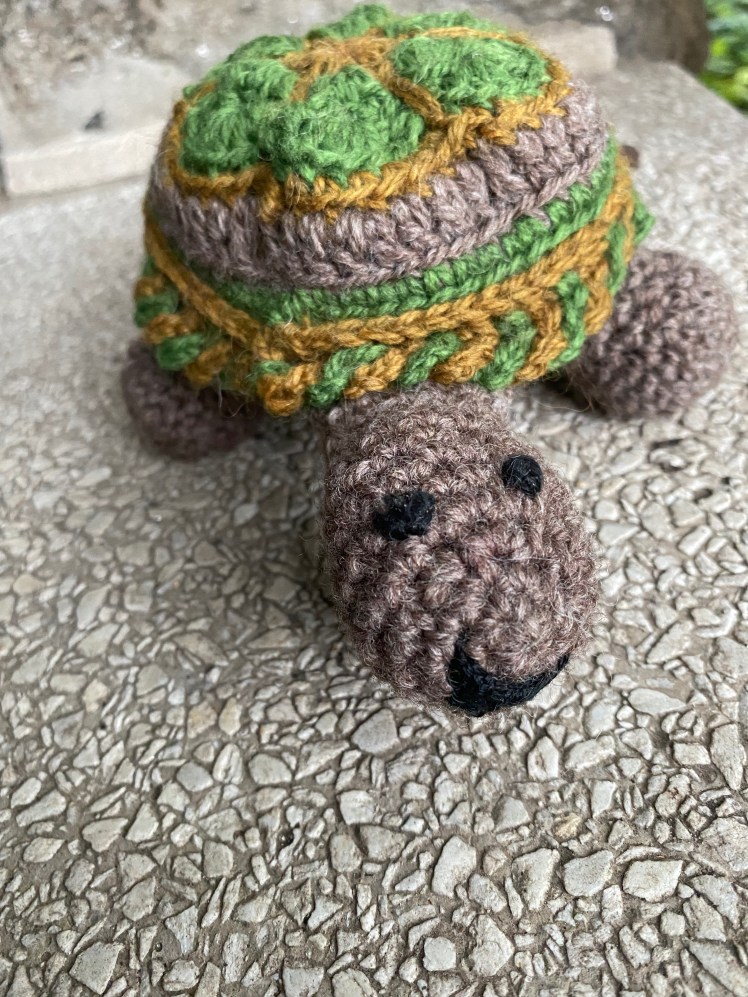 Then I ran across a crocheted turtle on Ravelry based on the African Flower pattern that I have crocheted intermittently for the last five years, and have recently crocheted quite a lot. The flower pattern was fresh in my mind, so I whipped up a couple of motifs in Frog and Toad colors for the shell and the underside of the body and loosely followed the instructions for the head and legs. The edging around the shell was a stitch pattern I’ve done before but forgot, and now I will never forget it again because it looks great and complicated but is really fun and easy. The crocheting was too holey to stuff with arborio rice, but I had undyed brown roving that blended perfectly with the Frog and Toad colors, and it filled the various turtle pieces nicely. I put a pinch of lavender buds into the roving, so it smells as nice as it feels in the hand. My embroidery skills are pretty hit-or-miss, and on Turtle’s face I definitely missed, but his lopsided smirk fits his role as one of the creatures laughing at Toad’s ridiculous swimming costume.