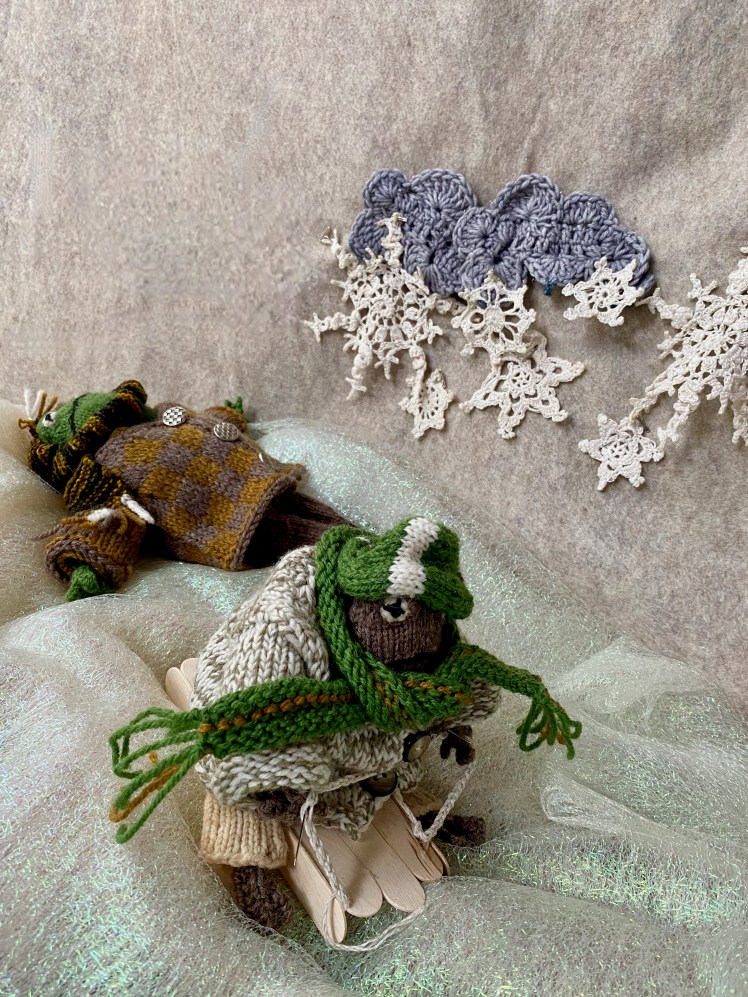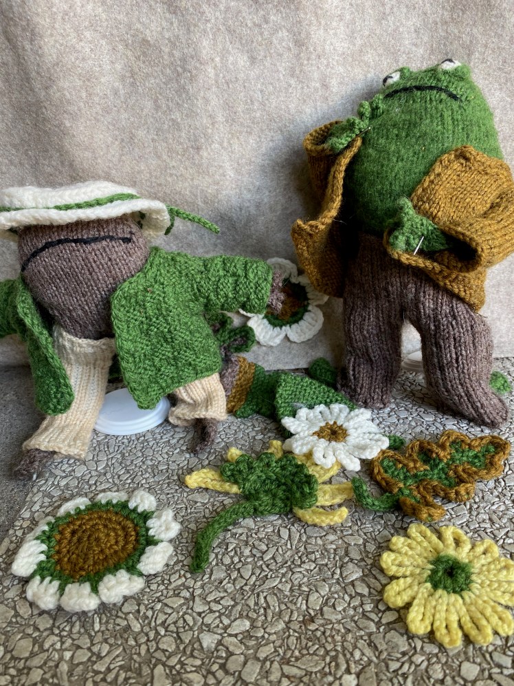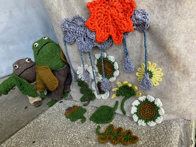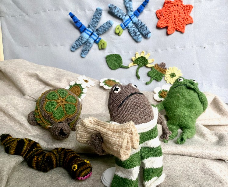 I didn’t notice when I fell down the rabbit hole at the time, but retracing my steps forensically, it was while I was knitting Frog’s and Toad’s bodies last spring when I encountered photos of crochet flowers, clouds, teacups, and everyday scenes created by Finnish textile designer Tuija Heikkinen. These items were charming and inspiring, but I can’t copy someone else’s work if I’m going to be inspired. I have to forget the exact appearance of the original sources and let my subconscious reinterpret them. So I thought, wouldn’t it be nice to be inspired by this someday, while a different part of my brain started thinking of other characters in Frog and Toad World, a snake, dragonflies, and the weather and plants, not realizing that the two thoughts were connected. Down the rabbit hole I tumbled.