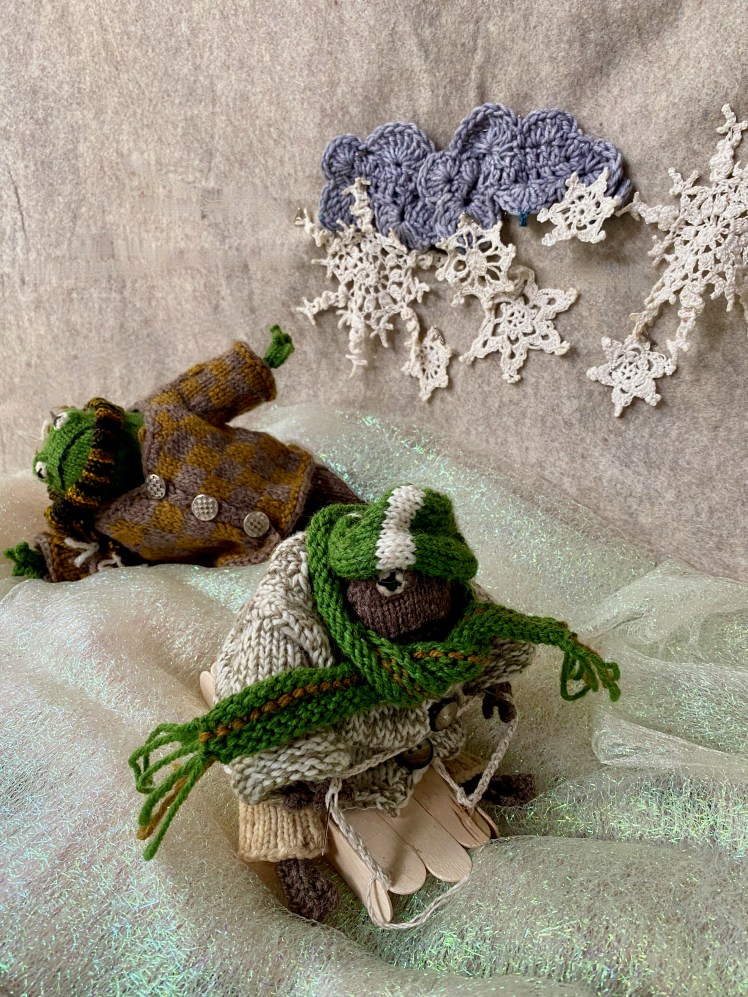 Toad had trousers, but he had given his jacket to Frog, so I made him another jacket just like the one with the buttons, but this one stayed the original green. Now he could be decently garbed. I could have climbed out of the the rabbit hole then, but ever since I tumbled down it, I had felt a compulsion to outfit the two of them for their sledding adventure, when Frog dragged Toad out of bed one snowy morning, stuffed Toad into winter gear, and the two of them went flying downhill on a sled. The sled hit a bump and Frog fell off the sled, but Toad sailed on, blissfully unaware that Frog was no longer with him until a crow clued him in, which rattled Toad so much that he wiped out.