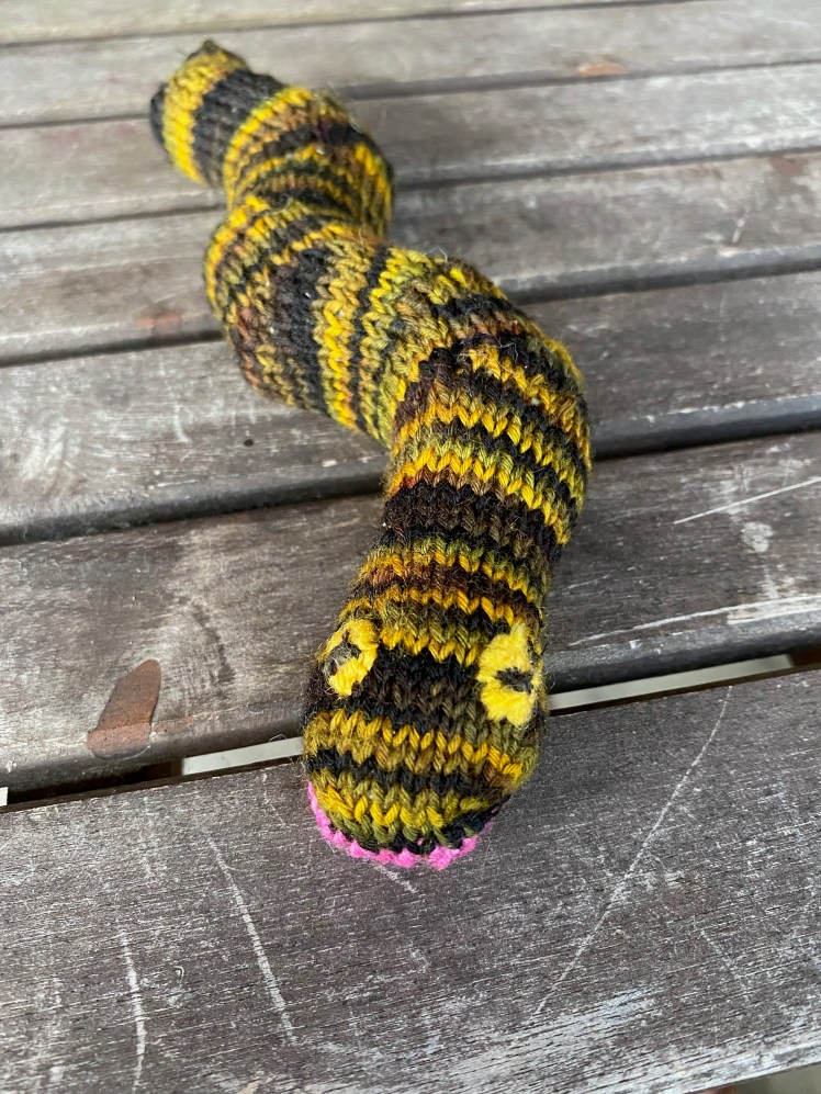 I’ve forgotten now exactly how I made the snake, but I think I put 24 stitches on three DPN’s and placed stitch markers 12 stitches apart, then knitted to two stitches after the stitch marker, wrapped and turned, purled to two stitches after the marker, W&T, knitted to the wrapped stitch, picked up the wrap and knitted it together with the stitch, W&T the next stitch, and so forth I think about six times. Enough so that there were several stitches on either side of the snake that never got short-rowed, which, on examining the finished snake, seems to be six short-rowed stitches on either side of center. Then I did a few rows of plain knitting around the tube and did another set of short rows over the same stitches, then a few plain rows, and repeated the process around the stitch marker on the other side. Repeat to exhaustion. When I was sufficiently exhausted, I increased about four stitches to make the head a little larger than the body, knitted a few plain rows, then decreased four stitches every other row as if I were knitting a cuff-down sock toe. There were a lot of holes at the short rows that needed to be reinforced before I could stuff the snake-bag with arborio rice and lavender buds, but it once it was stuffed, it felt like something I would never want to put down if I were a small child. I embroidered eyes and a laughing mouth after closing the head.