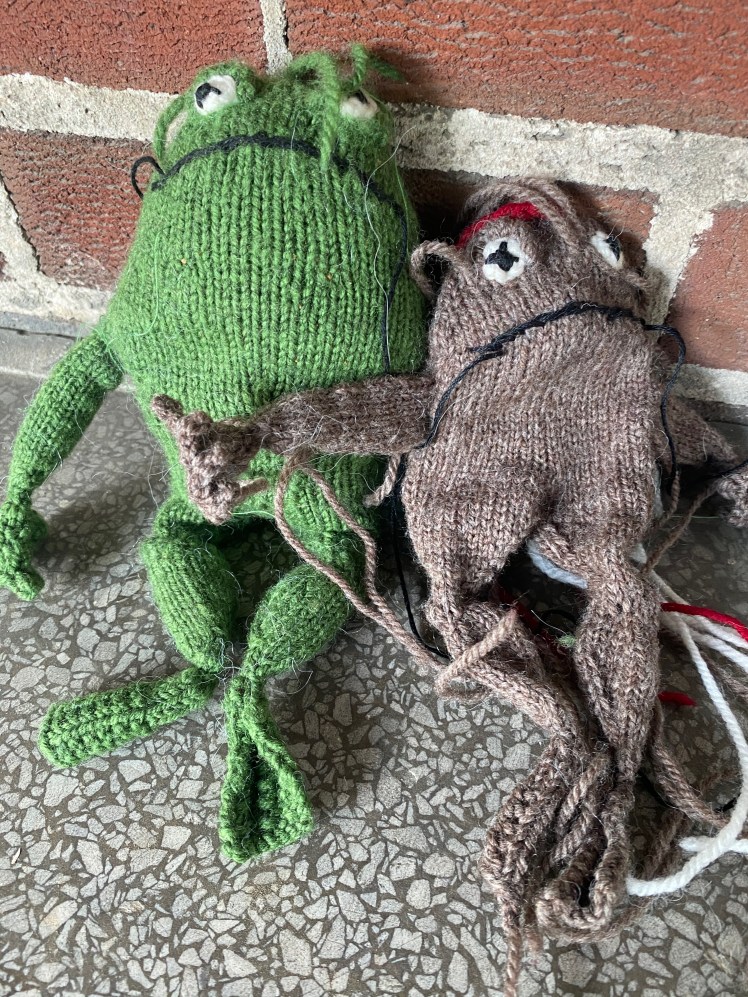 Kristina’s best advice to me was better than what I eventually did. She told me to undo the Kitchener stitching at the top of Frog’s head and dump out the ground walnut shell filling and replace it with arborio rice. She was skeptical of what I wanted to try, which was to see if I could felt Frog’s skin closed by dampening a small scrub brush and rubbing it all over his body so lift up the fibers and make them mesh together, but she said it might work. It reduced the leaking but didn’t stop it completely. Recently I borrowed Melissa’s hand carder tool, and it did a better job than my scrub brush. But then I undid the good the carder had done by sticking the wires of a doll stand into Frog’s body to hold him upright for the photographs, and the wires opened up some holes. I’ll have to card Frog’s little body again before I send him off in the mail. I took Kristina’s advice about arborio rice to stuff Toad, and his stuffing is staying where it’s supposed to be, inside his body. I will mention that knitting Toad was as slow and tedious as knitting Frog was, but Kristina’s instructions are perfection.