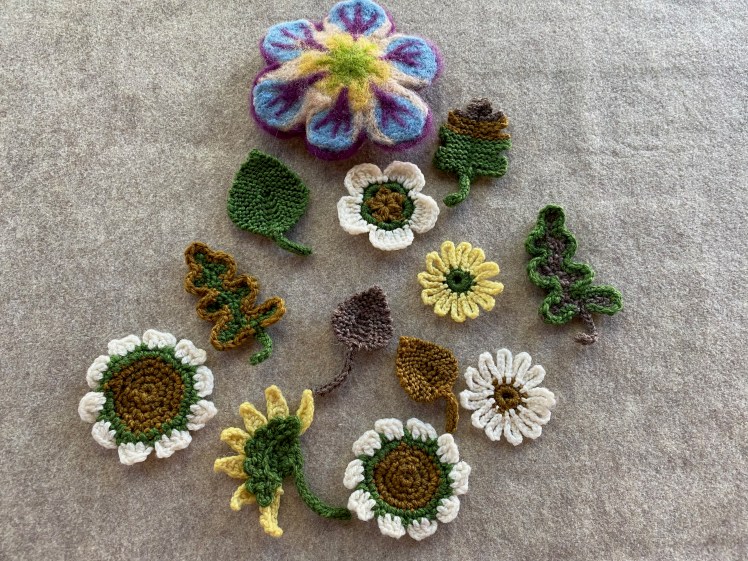 Then it was time to make the plants of Frog and Toad World. The patterns for the flowers and leaves came from 100 Flowers to Knit & Crochet by Lesley Stanfield, a fine book that I recommend highly. I crocheted six flowers using several patterns from this book and six leaves, some knitted, some crocheted. I stuck to the colors of the Frog and Toad palette, although I subsequently dyed a couple of the flowers a pale yellow using a depleted onion skins dye bath.