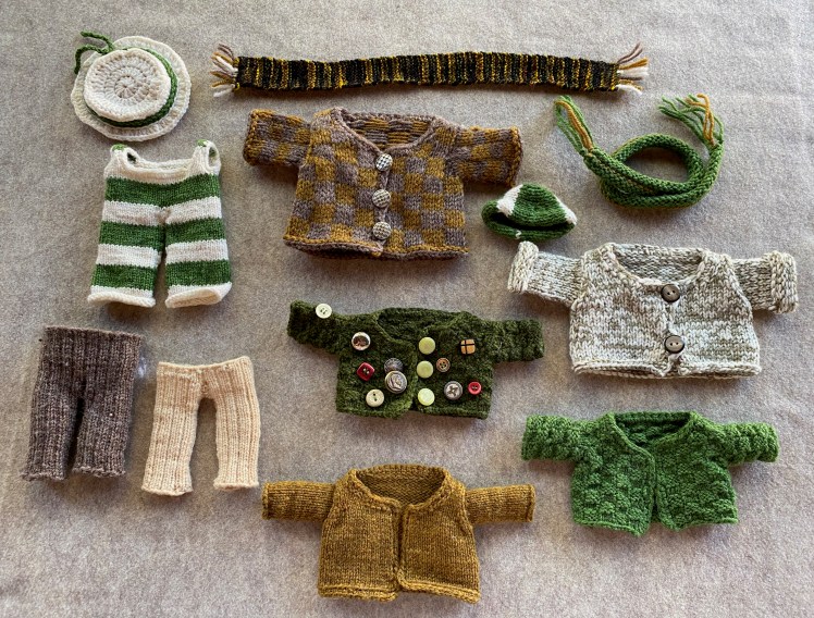 At this point I had reached the point in the rabbit hole that I had been putting off carrying out, which was knitting additional clothing to outfit some of the adventures in the stories. First, Toad needed trousers, since all he had was his silly bathing costume. Toad is shorter and smaller around than Frog, so I scaled down the pattern’s instructions for Frog’s trousers. I wanted to maintain the palette in the book’s illustrations as closely as I could for the clothing, and according to the illustrations in the book, Toad’s pants were a pale neutral. I knitted the pants in that bright white because that was all I had, but a nice long soak in a bath of used teabags gave the pants a tan corduroy color.