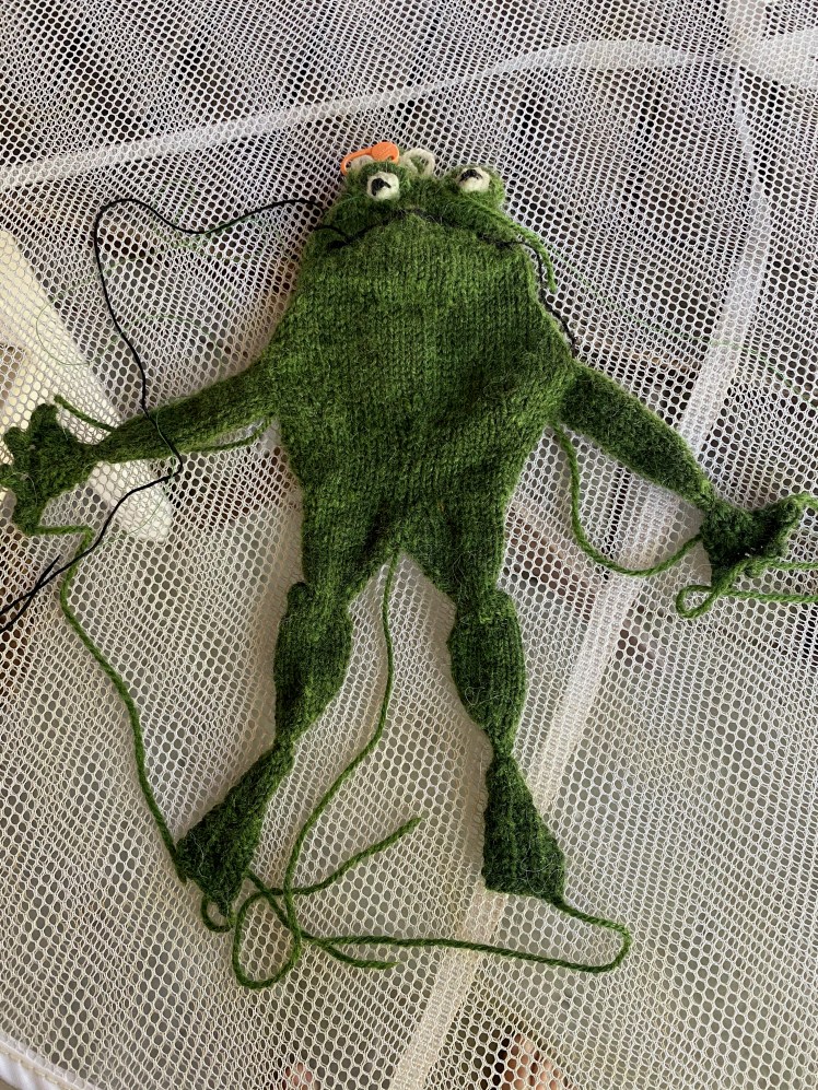 I took my time knitting Frog, bit by bit, no pressure, and eventually I had a completed empty Frog-bag. I closed up the crotch and the tiny openings at the wrist and ankles and reinforced the loose stitches at the increases and decreases, as per instructions.