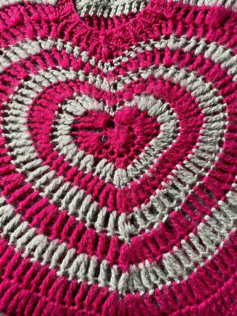 So by the time I wound my yarn and took out the crochet hook, that printout and my own brain were the guides I followed. The pattern offered some bread crumbs, my brain filled in the rest. I’m not a particularly skilled crocheter, but I know my way around sweater construction, and this was the most basic of dropped shoulder shapes. It consisted of rectangles for the front and back, smaller rectangles for the sleeves, and narrow rectangular ribbed strips for the cuffs at the wrists and the waist band. The pattern provided some information that I used. It gave measurements for the finished garment, which I adapted, and called for making the back first, with alternating stripes of two triple-crocheted rows in back-and-forth crochet. The front is built around the heart shape, which starts with a circle for the first row. On the second row, right and left of center, there’s a double crochet stitch, a couple of triple crochet stitches, a couple of double crochet stitches, and several single crochet stitches down to the bottom center of the heart shape. The instructions for the concentric stripes radiating out of the heart were hard to follow because they were written out in a long string of all-caps abbreviations, no chart, and missing information like where the start of the row was. I decided to start my concentric stripes at the top of the heart, not realizing that the pattern was starting at the bottom, and I wondered why my heart looked more heart-shaped than the photos. My version was an inadvertent improvement.