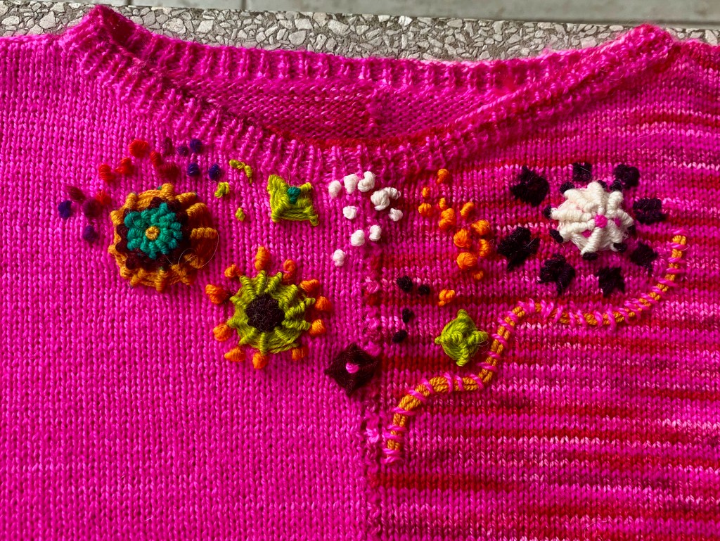 Yes, here’s to more embroidery! Looks great! And I especially like that very first sweater. One of my favorite things is making sweaters and socks from leftovers. More color is always better too!